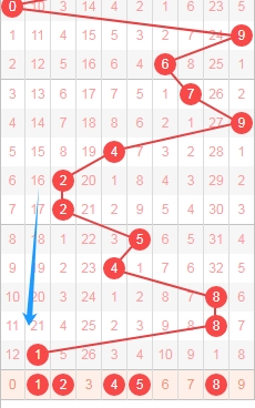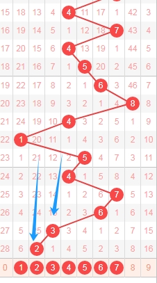 上图是福彩3D开奖号码从左到到右定位第一位走势图,我标注出来的蓝色箭头表示遗漏周期,上期开出数字1遗漏周期是21期,那么本期可以关注出遗漏周期小的数字12458,个人最看好数字2458。