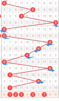 上图是福彩3D开奖号码从左到到右定位第二位走势图,我标注出来的蓝色箭头表示合数数字,很明显最近开出的合数数字多,那么本期可以关注出质数数字,那么就是关注数字12357,个人最看好数字1235。
