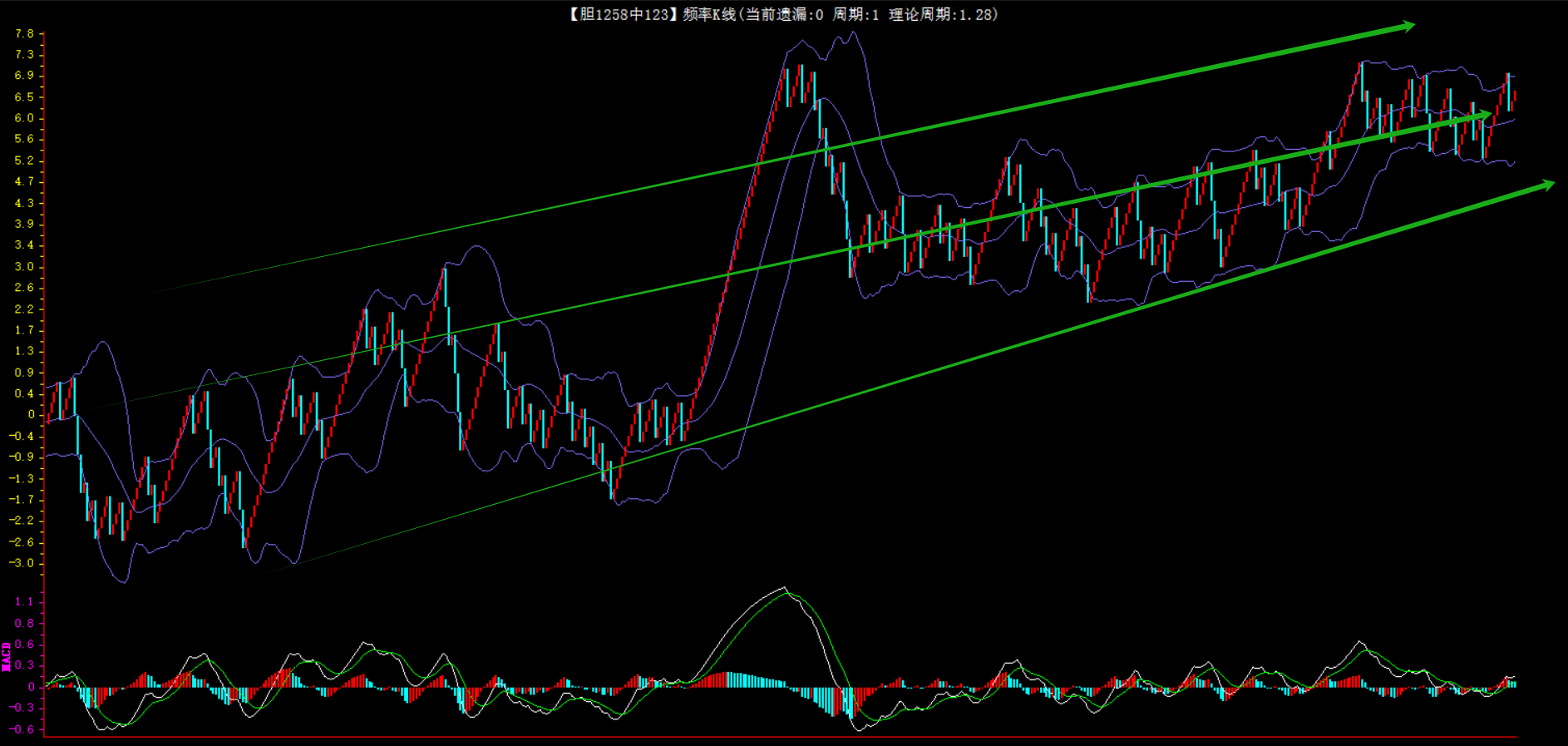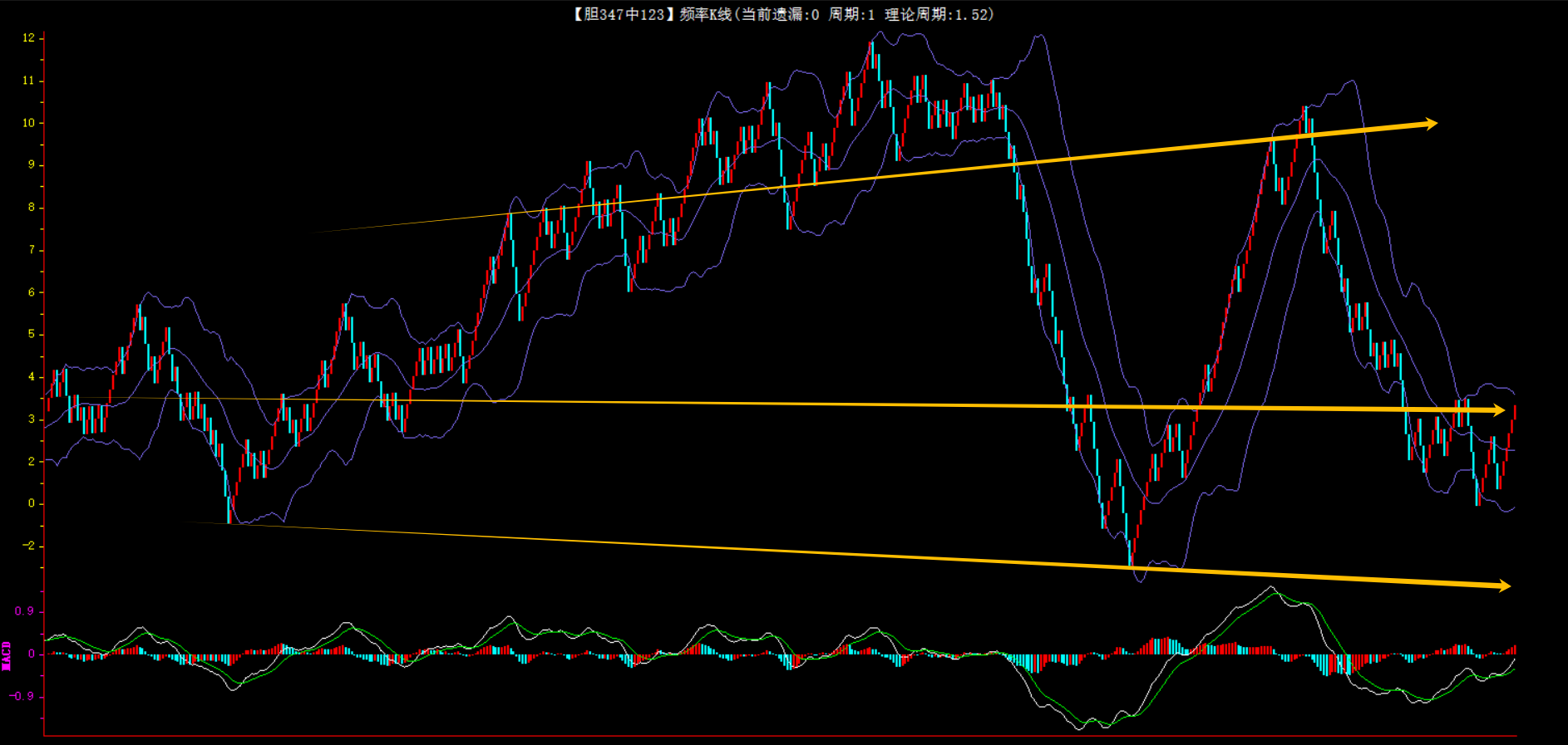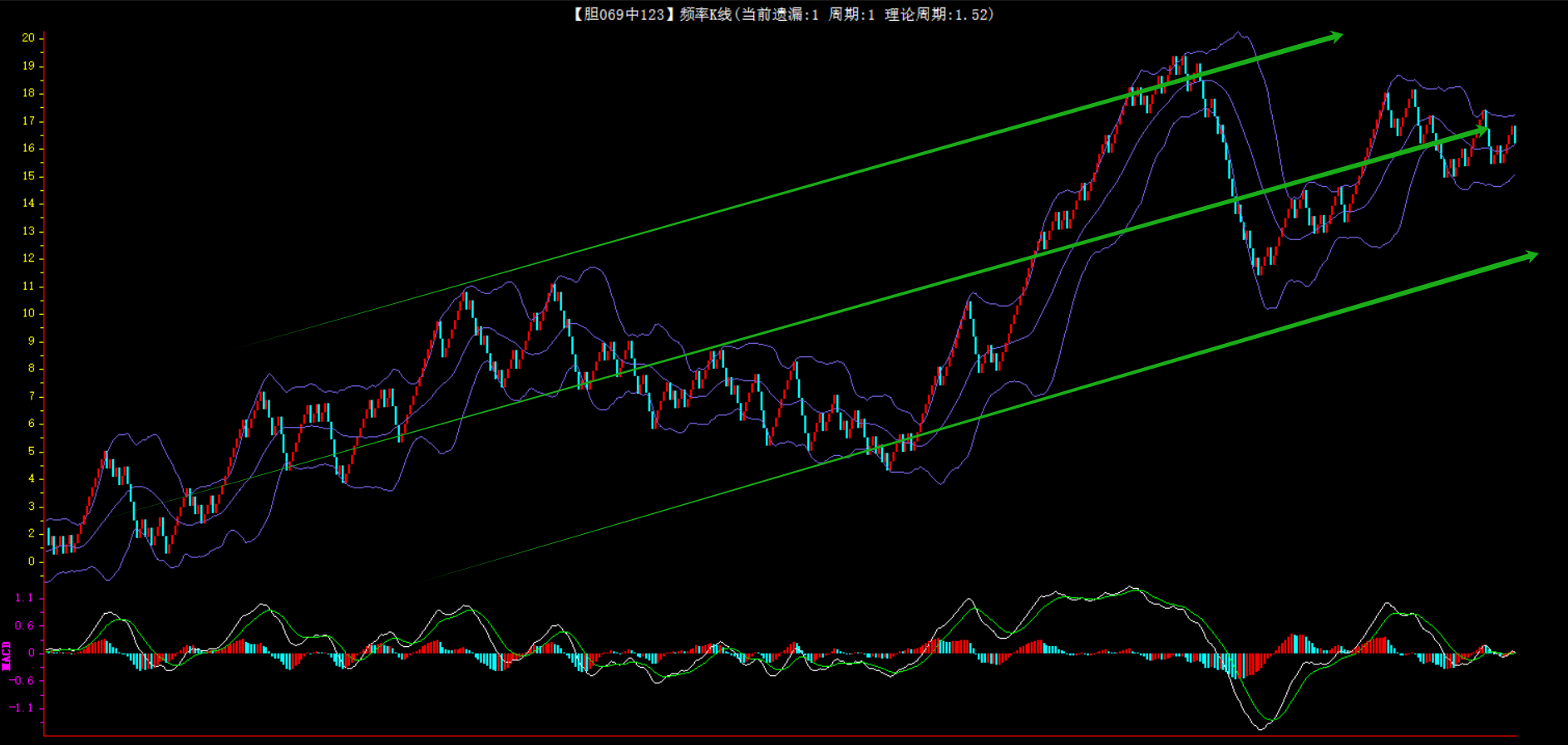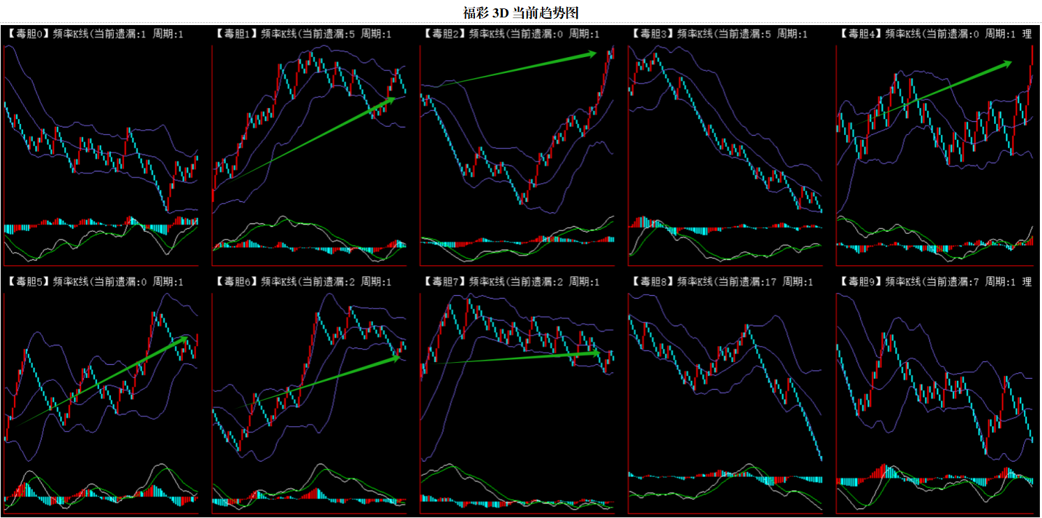整体趋势上行,上边沿线趋势向上,下边沿趋势也是向上,节点震荡,当前遗漏1期,本期关注。