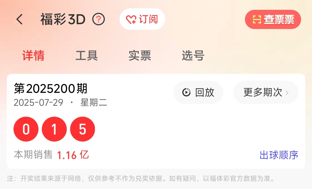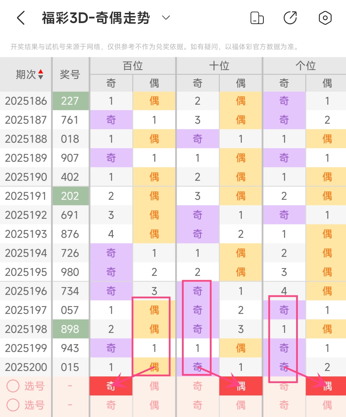首先让我们回顾一下上期福彩3D第2025200期开奖号码为015,为组六形态,大小比为1:2,奇偶比为2:1,和值为6,跨度为5。