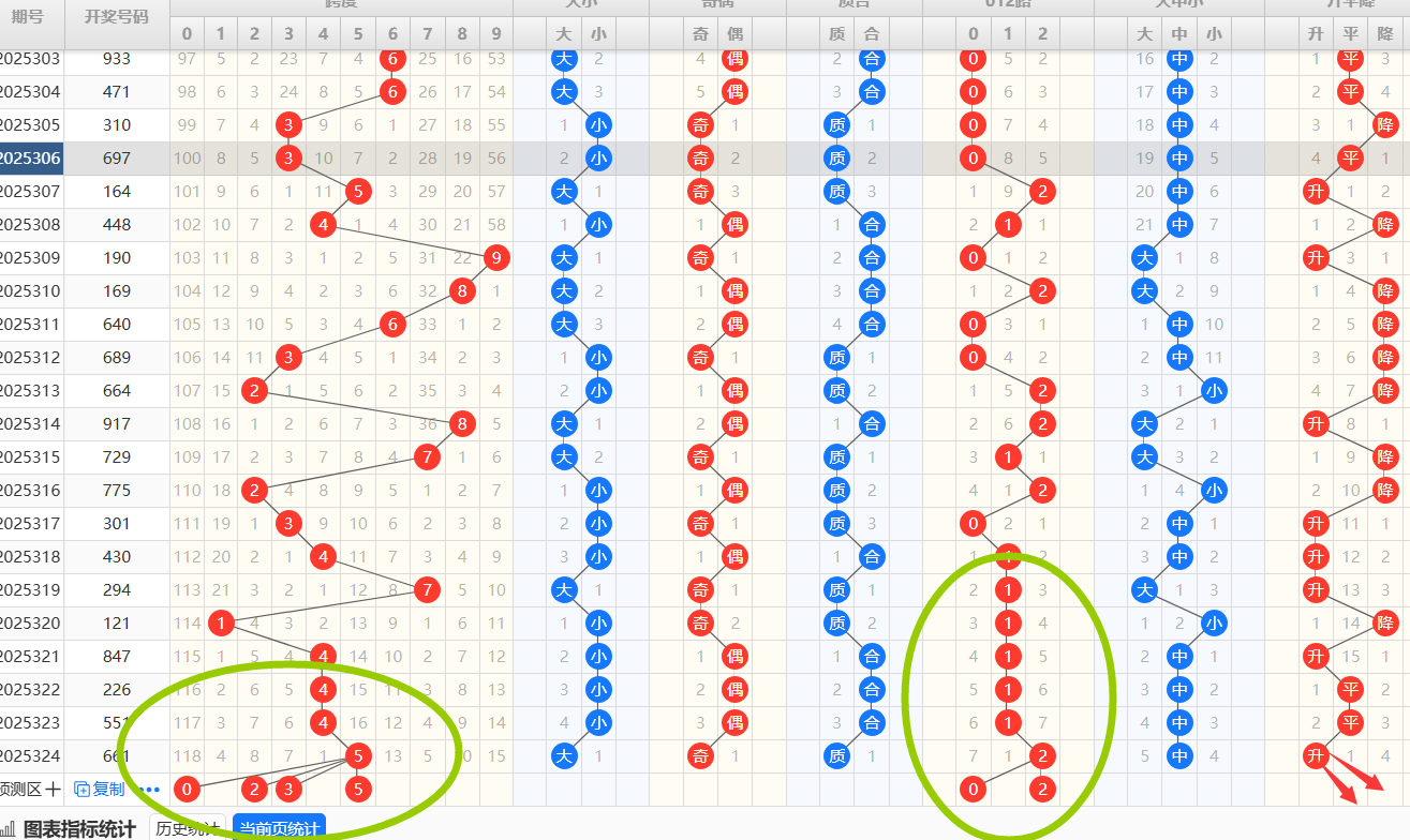 上期开出2路跨度5,本期跨度主看平降,跨度范围0-5。跨度的012路走势近期连开6期一路跨度,本期关注0/2路跨度开出。跨度可选0/2/3/5