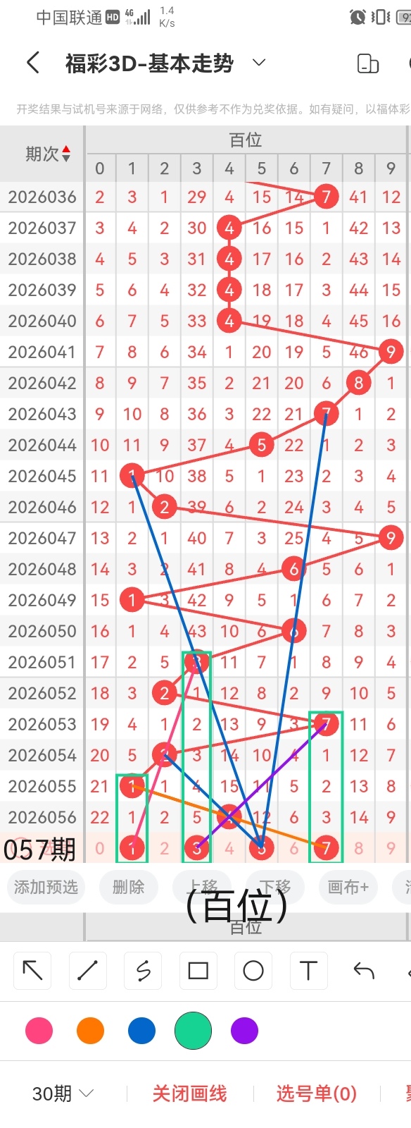 首先,小梁在这里给大家分享一个粉丝福利,给粉丝提供每期福彩3D杀一百位的号码:4;准确率高达95.36%。其次,小梁结合上图中画线的思路走势分析,号码1与前几期开出的号码呈隔期回补的走位且呈斜三连的走势,跨度3;号码3与前几期开出的号码呈斜三连的走势且呈隔五期回补的走位,跨度是1;遗落12期未出的号码5与前几期开出的号码呈左右三条斜三连的走势,跨度1。然后,小梁结合上图中的画线思路走位分析,号码7与前几期开出的号码呈斜三连的走势且呈隔三期回补的走位,跨度为3。综上所述,小梁推荐本期百位的号码为:1、3、5、7。