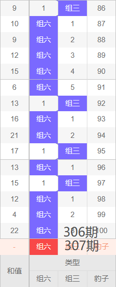 上期形态:组六,近10期的形态分别为:组六,组三,组六,组六,组三,组六,组三,组六,组六,组六,近期组三和组六的形态比较规律性,根据以往形态规律,本期个人认为需要重点关注组六落位,同时也需要防组三形态的开出。