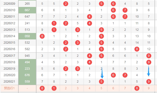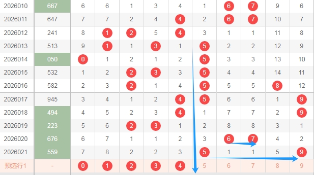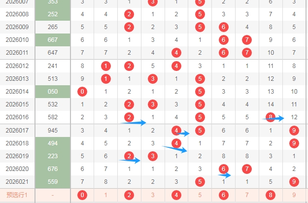 上期开奖号码是559是全奇数组合,那么本期偶数02468至少得关注出1个吧。从上面走势图中标注出来的蓝色小箭头就知道,最近出现的偶数并不多。