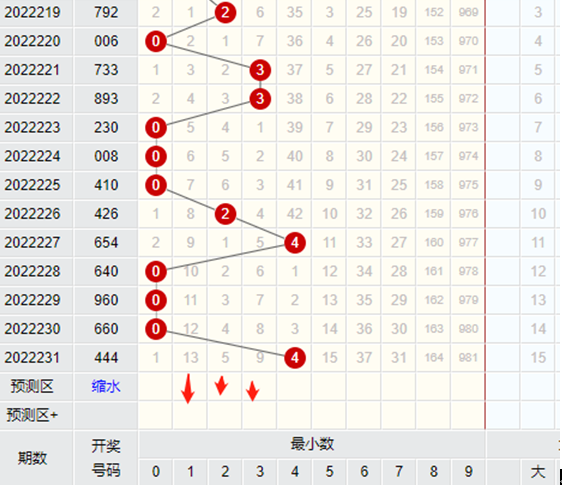 通过上图来看,近期福彩3D里最小数最近9期开出的号码分别是0、2、4,这个数字组合是非常奇怪的,9期最小数字为偶数,那么就造成了3D最小数字为奇数非常奇缺,那么我们就会把目光锁定在号码1和3上,用1和3来做胆码,并且1和3作为最小数字是最完美的数字组合。