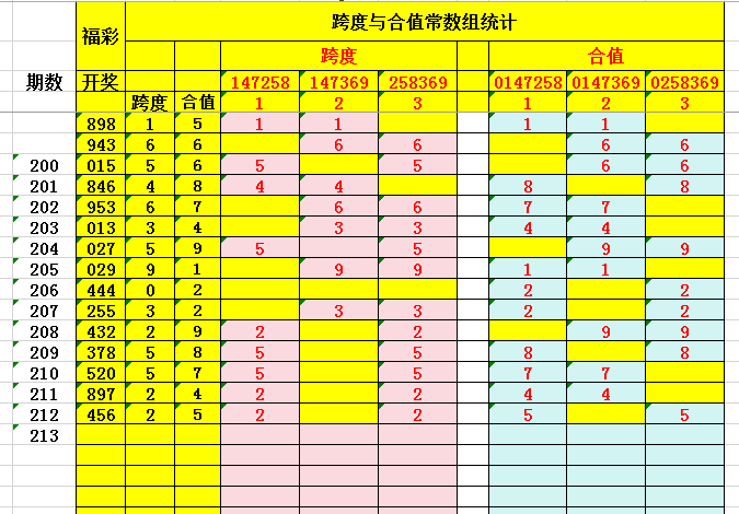 二、本期跨度合值分析 将跨度设定为0147258、0147369、0258369三个常数组,跨度常数组的设定,旨在将彩票号码可能出现的跨度范围进行系统分类,为后续的数据分析提供基础。合值设定为0147258、0147369、0258369三个常数组;合值常数组的划分,同样是为了规范合值数据的分析维度,使历史数据的统计与对比更具逻辑性和参考价值。根据这一规则,结合往期开奖跨度及合值的数据,构建一个数字表格,通过对历史数据的长期积累与持续分析,能够更精准地把握跨度与合值的变化趋势,从而有效压缩投注号码范围,提高投注效率(注:可结合012分析进一步压缩范围)。