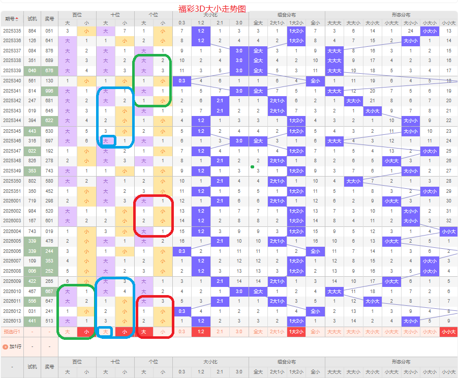 上期大小比为1:2,两小的号码组合方式,从近五期出现情况看,大号码出现8次,小号码出现7次,大小号码出现较平均,本期侧重两小的号码组合,本期百位侧重小号码,十位侧重小号码,个位要侧重看大,侧重小小大或者大小小的号码组合,根据大小做五码定位01234/01234/56789或56789/01234/01234