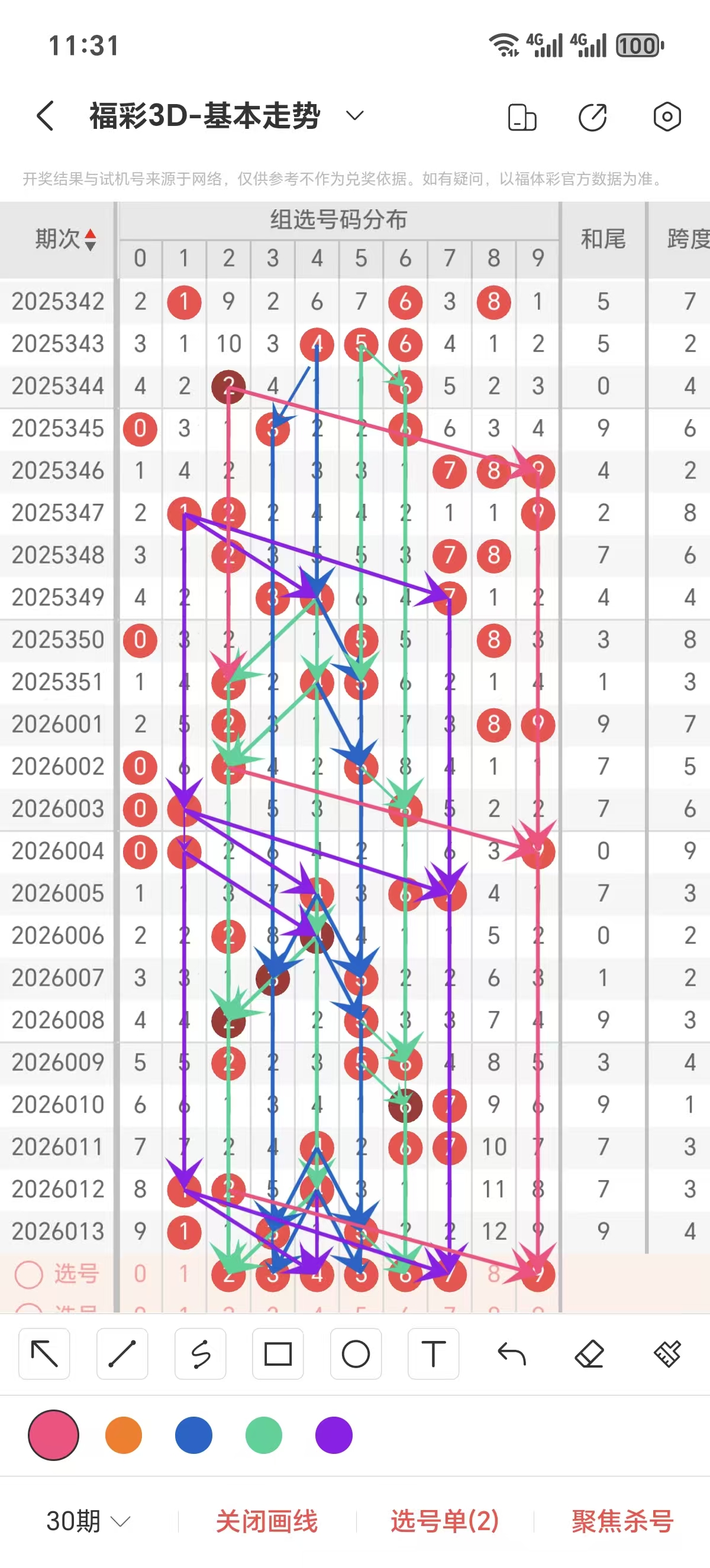 跨度通常情况下在五期之内重复一个跨度的概率很高,近五期重复了3/4的跨度,近五期跨度为4/1/3/3/4,近期01路的跨度较热,上期是1路的跨度,本期要侧重跨度以4/5/6跨为主的号码组合。可以从跨度方面选择相应的双胆码组合,双胆码的选取要根据近期和历史的走势进一步的分析选取。