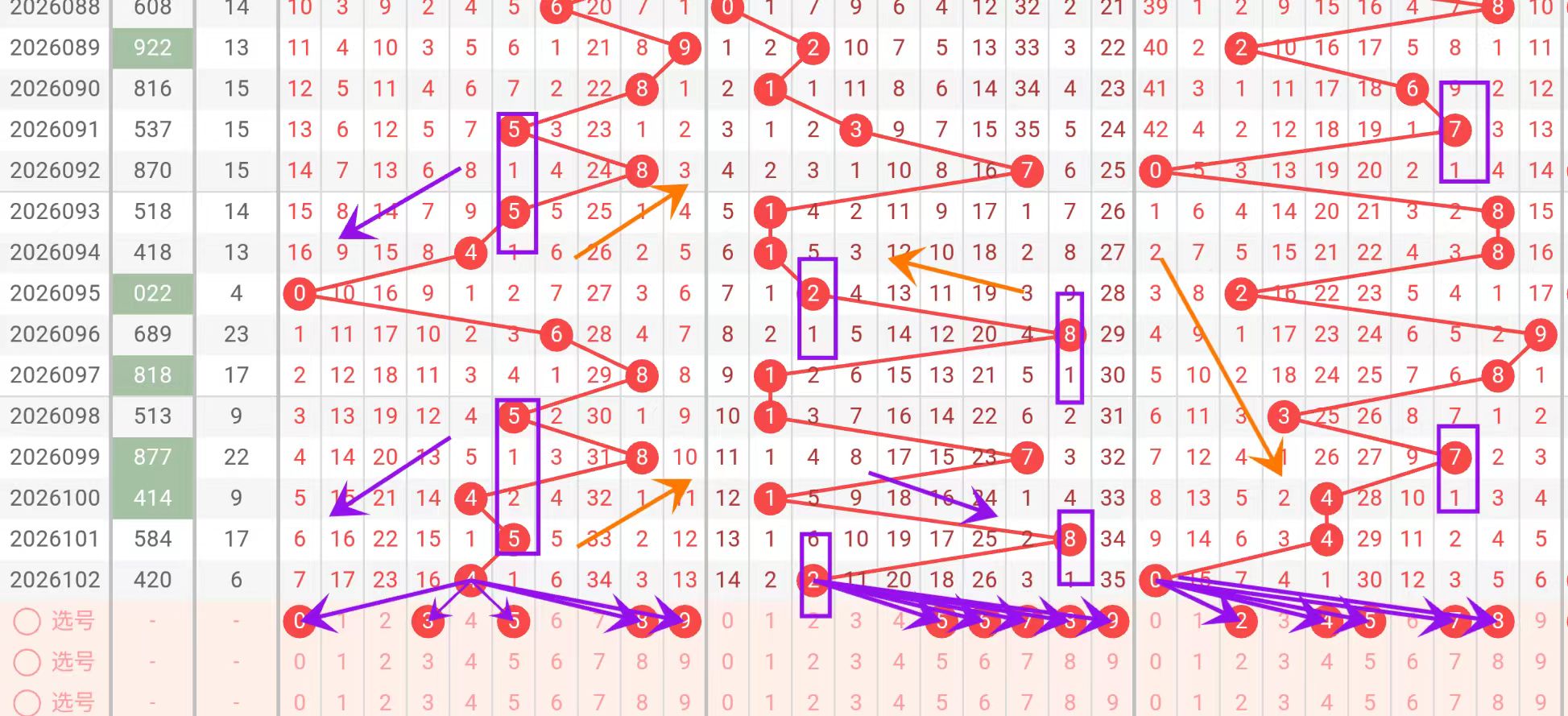 上期十位开出中间号码为 2,与上期开奖号码和值为10,如图所示我方框标记6095期同样开出号码 2 ,与上期相同,其表现形都是小大小大,走势结构依然稳定,都是依靠热号1 依托 2 3 7 8 结合上轮走势,本期可能回调,但任然需要预防冷号。