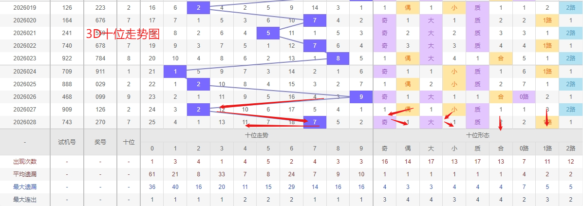 福彩3D十位分析:第2026028期十位开出号码7属大奇数号码后端。以历史100期数据为例十位奇偶比约为55比45,大小比约为53比47近期大小相差5点,根据求均衡的规律开出大数的概率比小数高一点。上期我们分析偶数经过连续回补后有走奇数的可能,开出奖号7大奇数符合我们的预期。近期3D十位走势分析,号码5表现活跃,呈现明显的热态特征,短期内仍有较大概率继续开出,需重点防范其持续走强。与此同时,号码0和3均已遗漏较长周期,进入冷号区间,历史数据显示,冷号在积累一定遗漏后往往会出现技术性回补,因此对0和3的突然反弹需保持警惕。综合来看,在追踪热号5的同时,也需密切关注冷号0与3的转折信号,所以福彩3D第2026029期十位推荐03589。