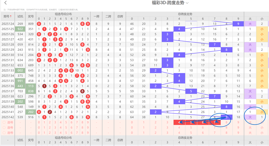 通过观察跨度及跨度属性走势可以发现:近10期内跨度大数号码出号后,下期容易连开大数号码,上期跨度开出了大数号码8,本期跨度仍可能会开出大数号码,因此本期跨度应该考虑大数号码出号。结合上述跨度走势图来看,本期跨度仍然看好567,防4等号码。
