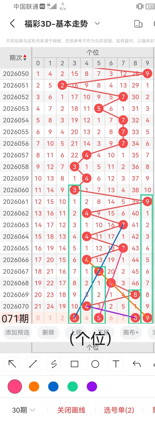 首先,为了感谢各位老板对小梁的关注和打赏,小梁特别提供一个杀个位的小技巧,同尾杀号法,准确率相还可以,但是要记住任何杀号都不能保证百分百准确的哦。小梁根据同尾杀号法,得知本期杀个位1。其次,小梁参照上图中的画线思路走势可以看出,号码3与前几期开出的号码呈斜三连的走势且呈隔十期回补的走位,跨度1;号码5与前几期开出的号码呈隔三期回补的走位且呈斜三连的走势,跨度为1;号码8与前几期开出的号码呈隔期回补的走势且呈斜连前后相互对称的走位,跨度4;号码9与前几期开出的号码呈斜四连的走位且呈隔九期回补的走势,跨度是5。综上所述,小梁参照上图中画线的思路走位可以看出,推荐个位的号码为:3、5、8、9。