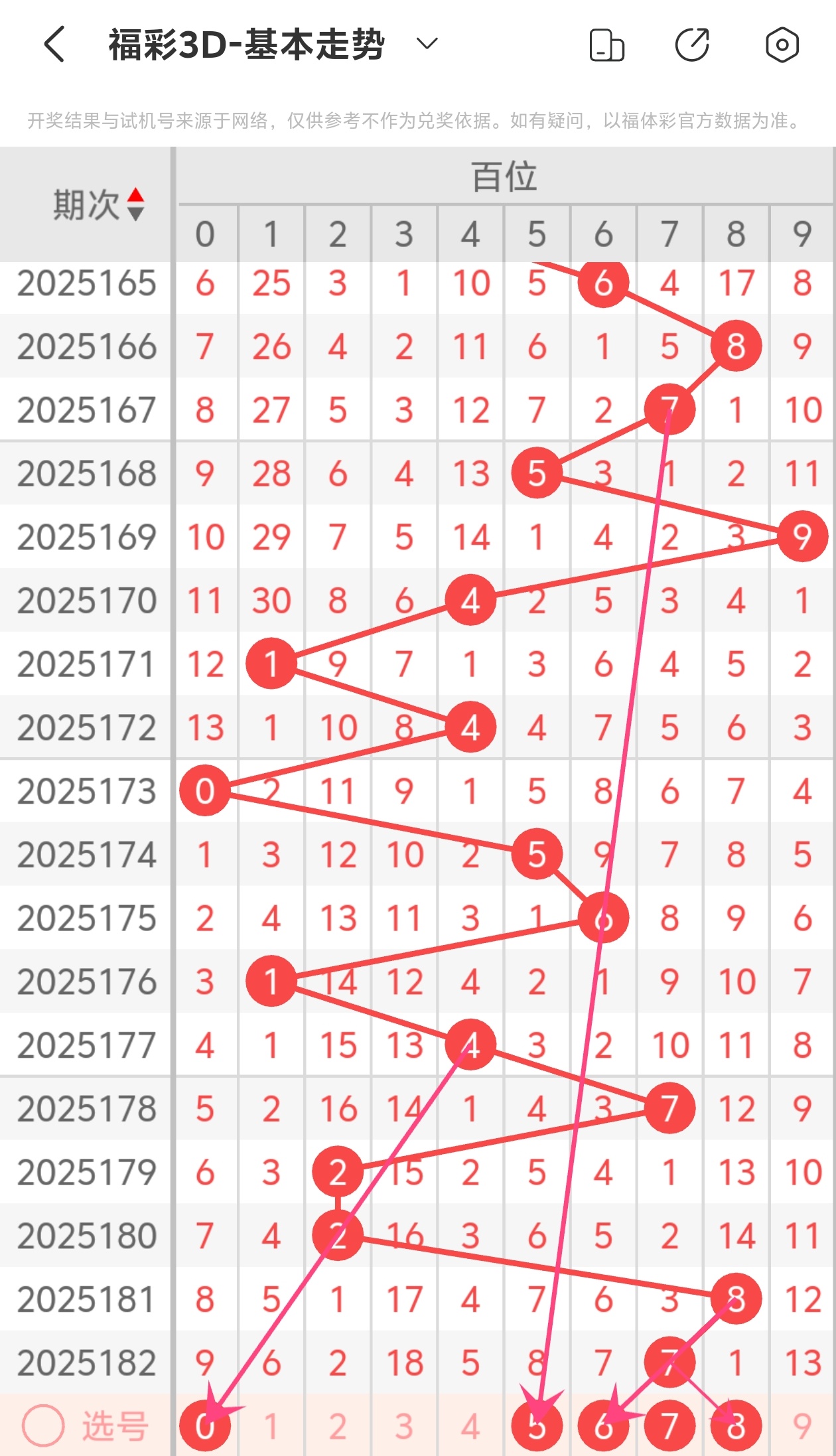 上期百位开出7,本区与上期的跨度为1,本期我们可以从上面走势图中看出选号的思路,0为斜连走势,5为斜连走势跨度为二,6为斜三连走势,7为重码,8为分边走势,综合以上分析,本期百位推荐:05678