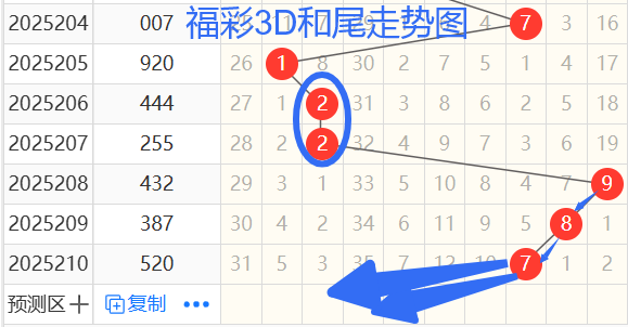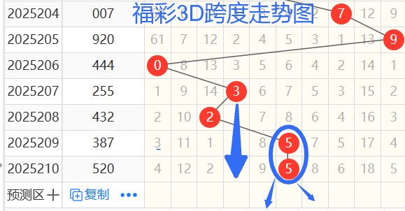2)我们来看跨度;还是以206期——210期为例,如图依次是03255跨度,按照路数转换关系来看,那么跨度我们暂定147369跨,本期个人比较看好 3 4 6 跨。