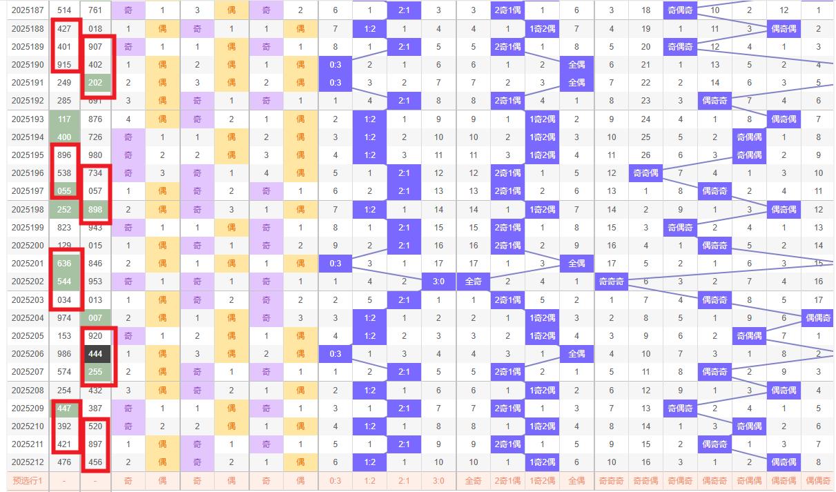 奇偶比例预判 在奇偶比例方面,第212期开出了偶奇偶的组合,显示出偶数号码的强势。然而,根据奇偶比例的自然平衡原理,偶数号码在第213期有望得到更多的关注。因此,213期的奇偶比例可能为1:2,即偶数号码占据多数。这种预判基于对历史数据的深入分析,以及对奇偶比例波动规律的把握。奇偶比例为1:2,大小比例为1:2的号码,如:0(小偶)、5(大奇)、4(中偶);