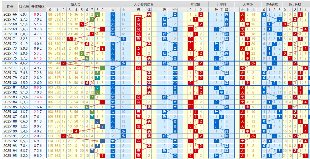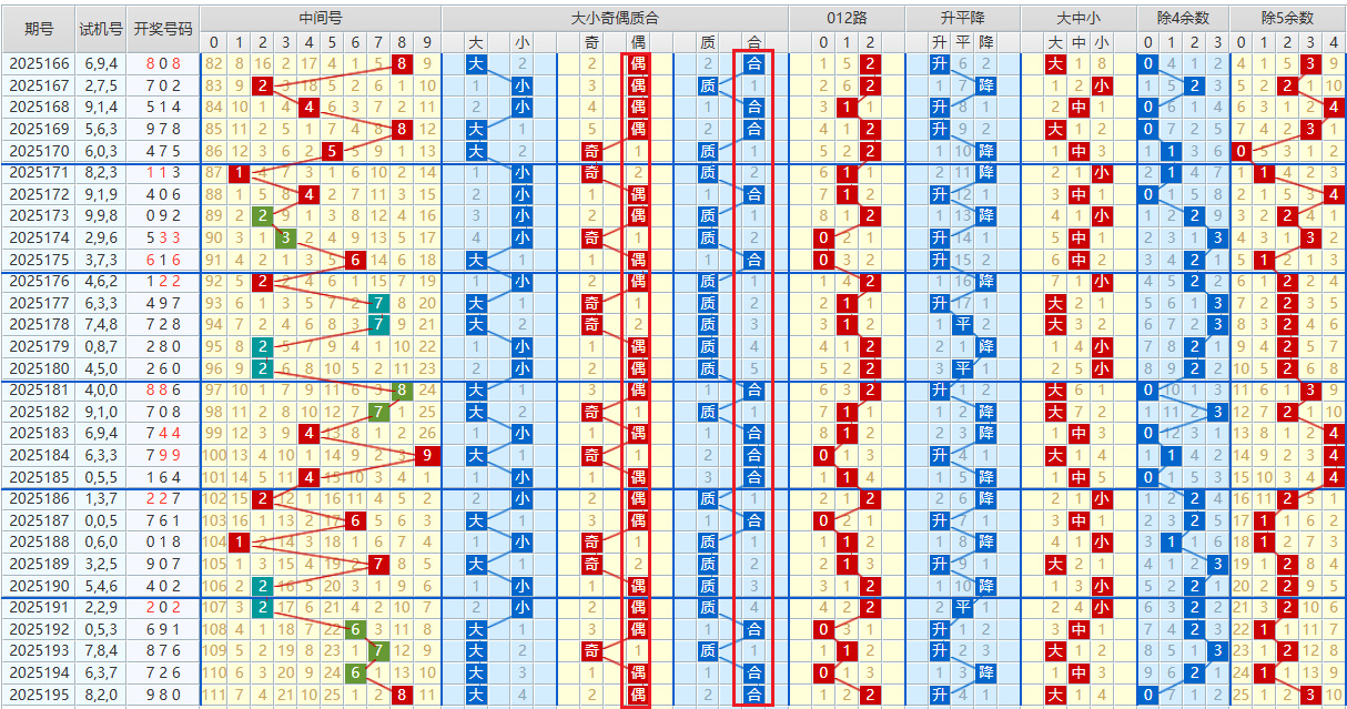 2025195期开出980,最大号9,中间号8,最小号0,和值17,均值6,跨度9