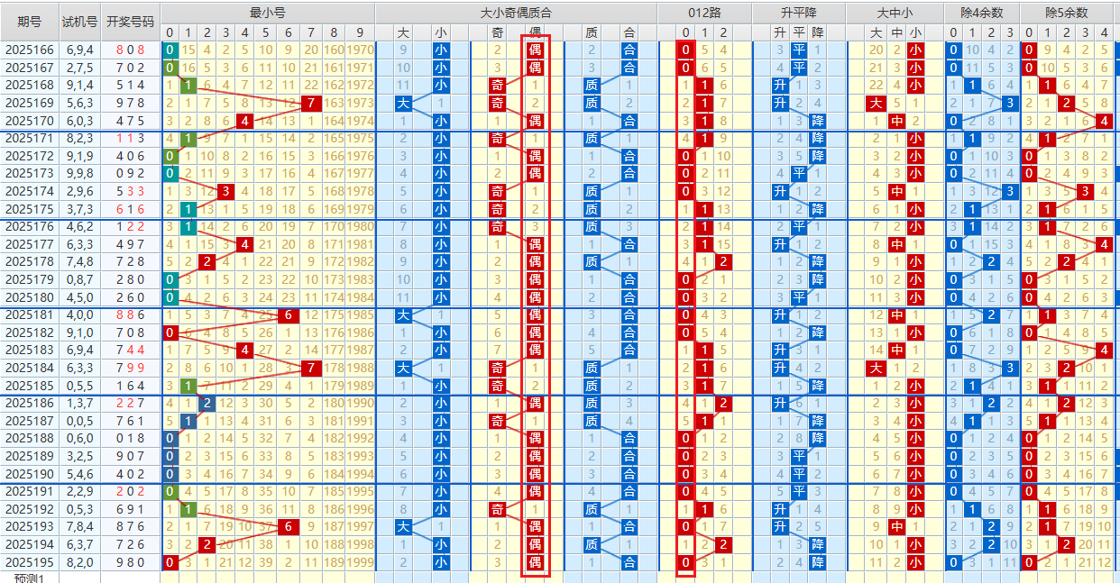 中间号在4-6区间聚集度较高(占比52%),195期中间号8属偏态值(近100期仅8%)。统计显示,中间号≥8后,下期回落至4-6区间的概率超80%。奇偶方面,奇数中间号(如5、