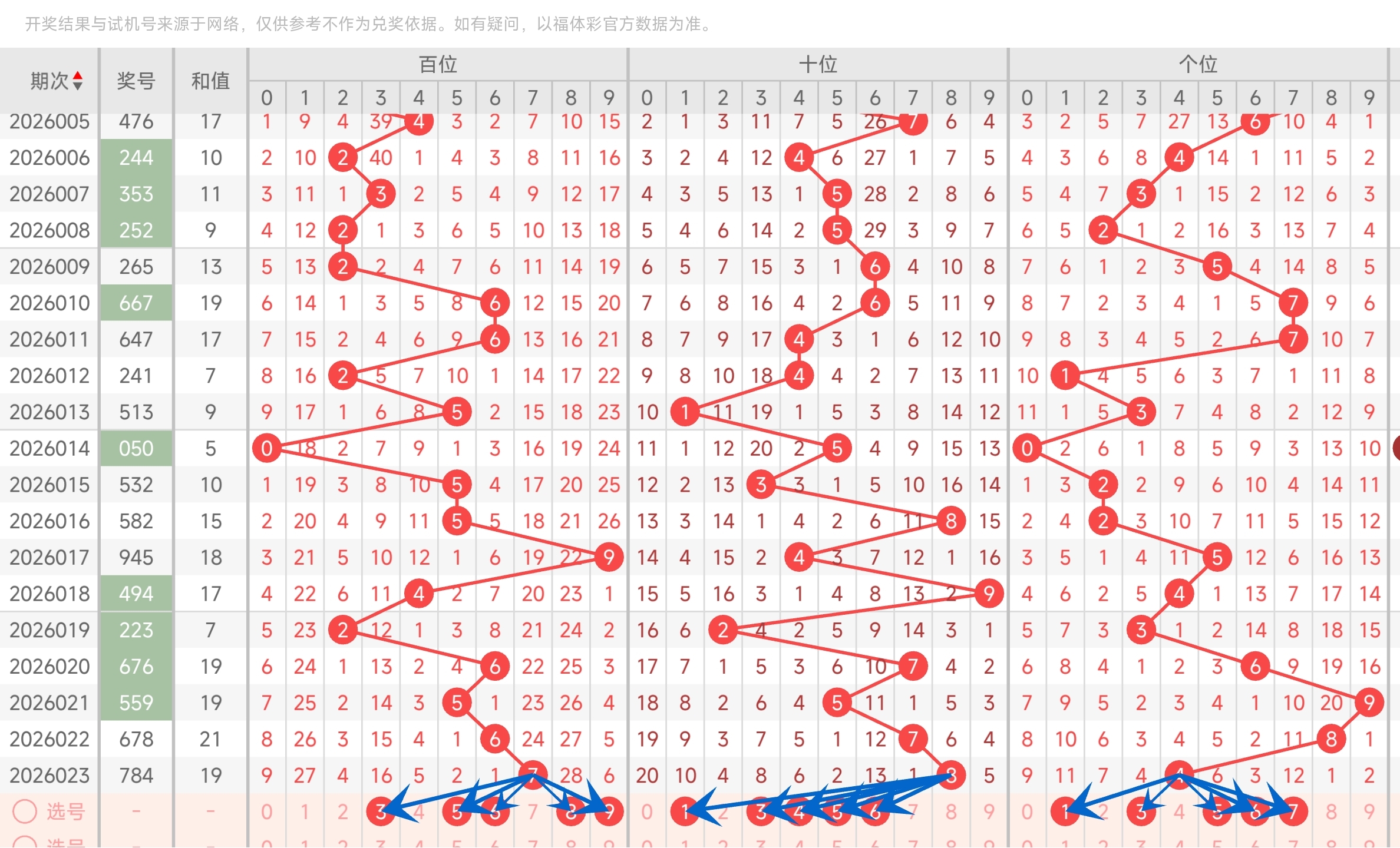 第2026023期福彩3D分析文章,5码定位命中784,6码复式命中784。