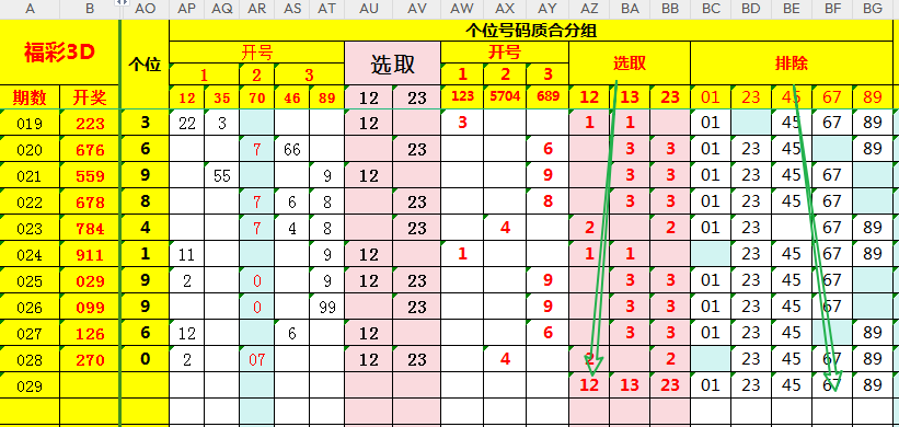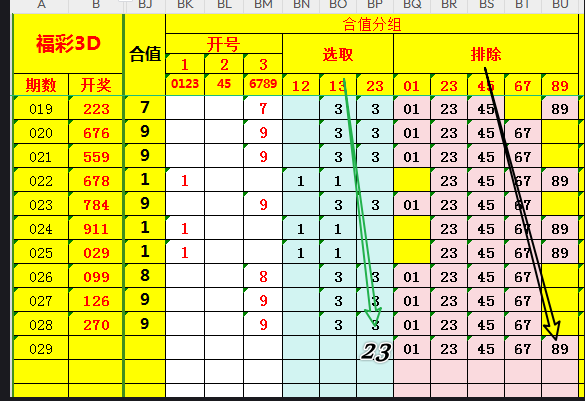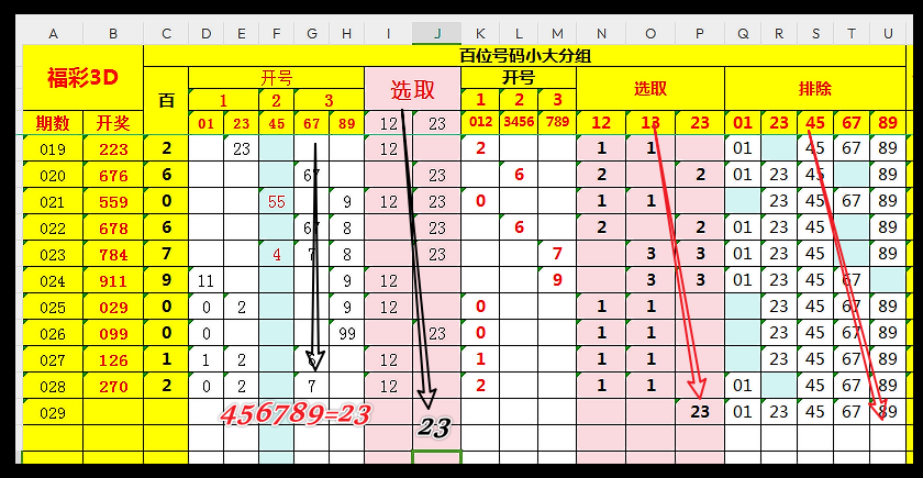 复盘数据,本期选取合值23=456789,排出89,即本期合值定4567;