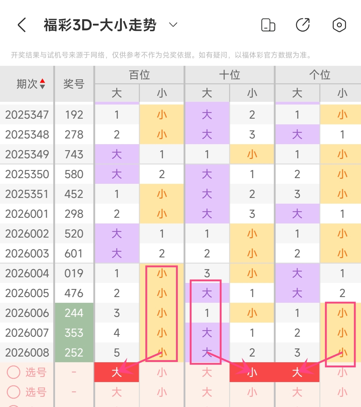 首先让我们回顾一下上期福彩3D第20260078期开奖号码为252 ,为组三形态,大小比为1:2,奇偶比为1:2,跨度为3,和值为9。