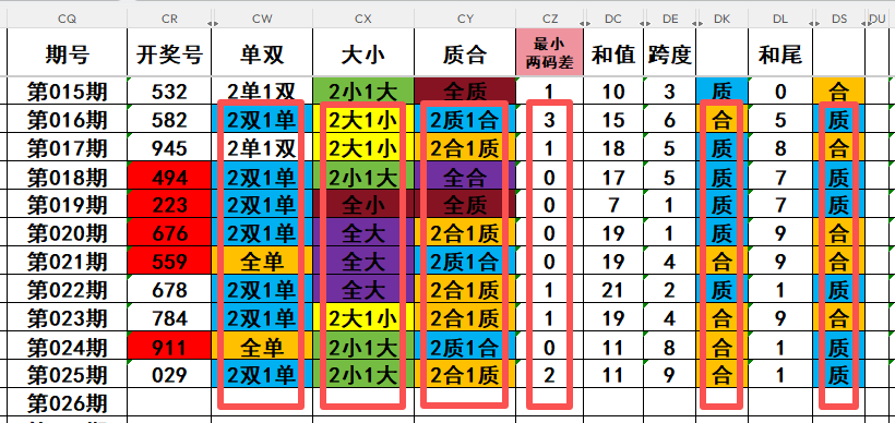 3,最近10天当中,两质一合开出3次,两合一质开出5次,全质数开出1次,全合数开出1次。近期需重点关注开奖号两质一合的回补!