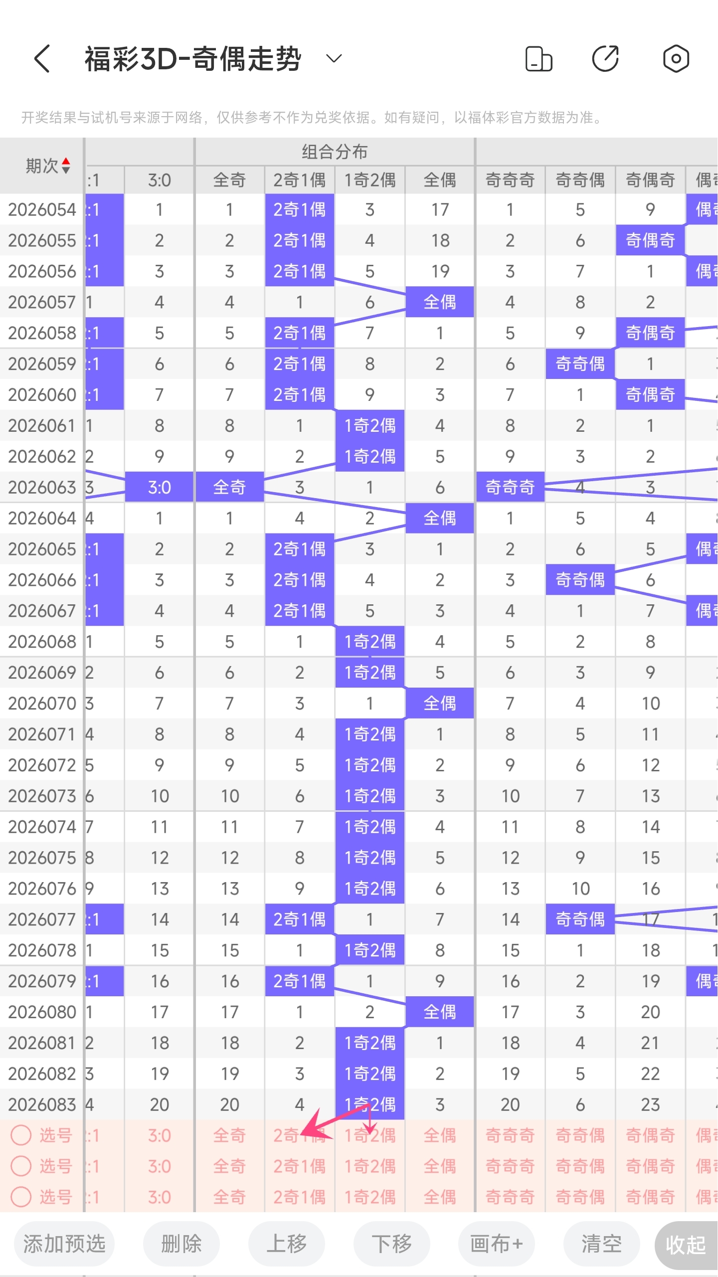 上期开了1奇2偶的情况,往前一期开出的是1奇2偶。从组合数学理论上来讲,开出2奇1偶和1奇2偶的概率都为37.5%,开出全偶和全奇的概率为12.5%。通过分析目前30期内的数据。本期的开出全偶的概率是13.33%,开出全奇的概率为3.33%,开出1奇2偶的概率为46.66%,开出2奇1偶的概率是36.66%。和前一期相比,1奇2偶概率变大,全奇概率变小。通过走势图分析,上期开了1奇2偶,推测本期可能开2奇1偶,其次是1奇2偶,然后是全奇或者全偶类型。