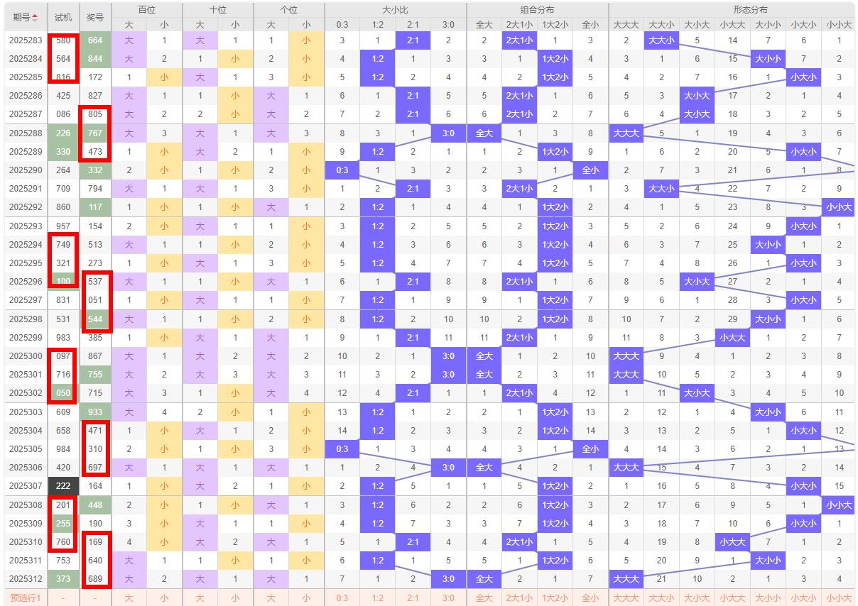 大小走势分析 在312期中开奖号689,大小比为3:0,大数占据优势。回顾历史数据,发现大小比常常在短期内呈现波动,但长期趋于平衡。因此,在313期中,大小比将继续调整,倾向于保持大数优势。基于这一逻辑,预判313期的大小走势可能为“大小大”或“大中小,这样的组合不仅符合历史波动规律,也体现了当前大小比调整的趋势。近十期大小比为14:17小数占据优势关注两大一小号码