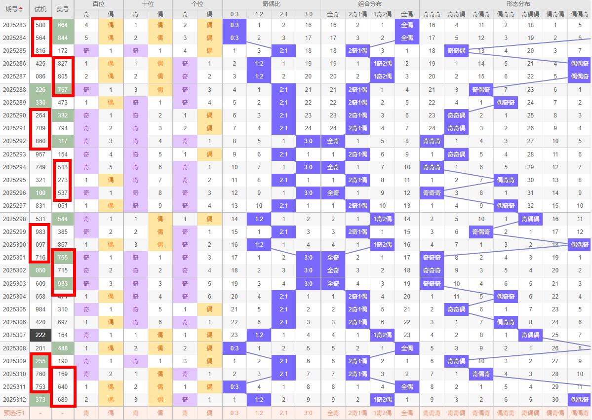 奇偶比例分析 312期的开奖号码为689;奇偶比为1:2,偶数占据主导地位。在奇偶比例的分析中,同样注重平衡原则。考虑到近期奇偶比的波动,可以预判313期的奇偶比例将继续保持平衡,即可能为2:1或1:2。这样的预判不仅符合历史数据的统计规律,也体现了奇偶比例在短期内的调整趋势,近十期奇偶比为15:15.所以福彩313期重点关注两奇一偶号码。