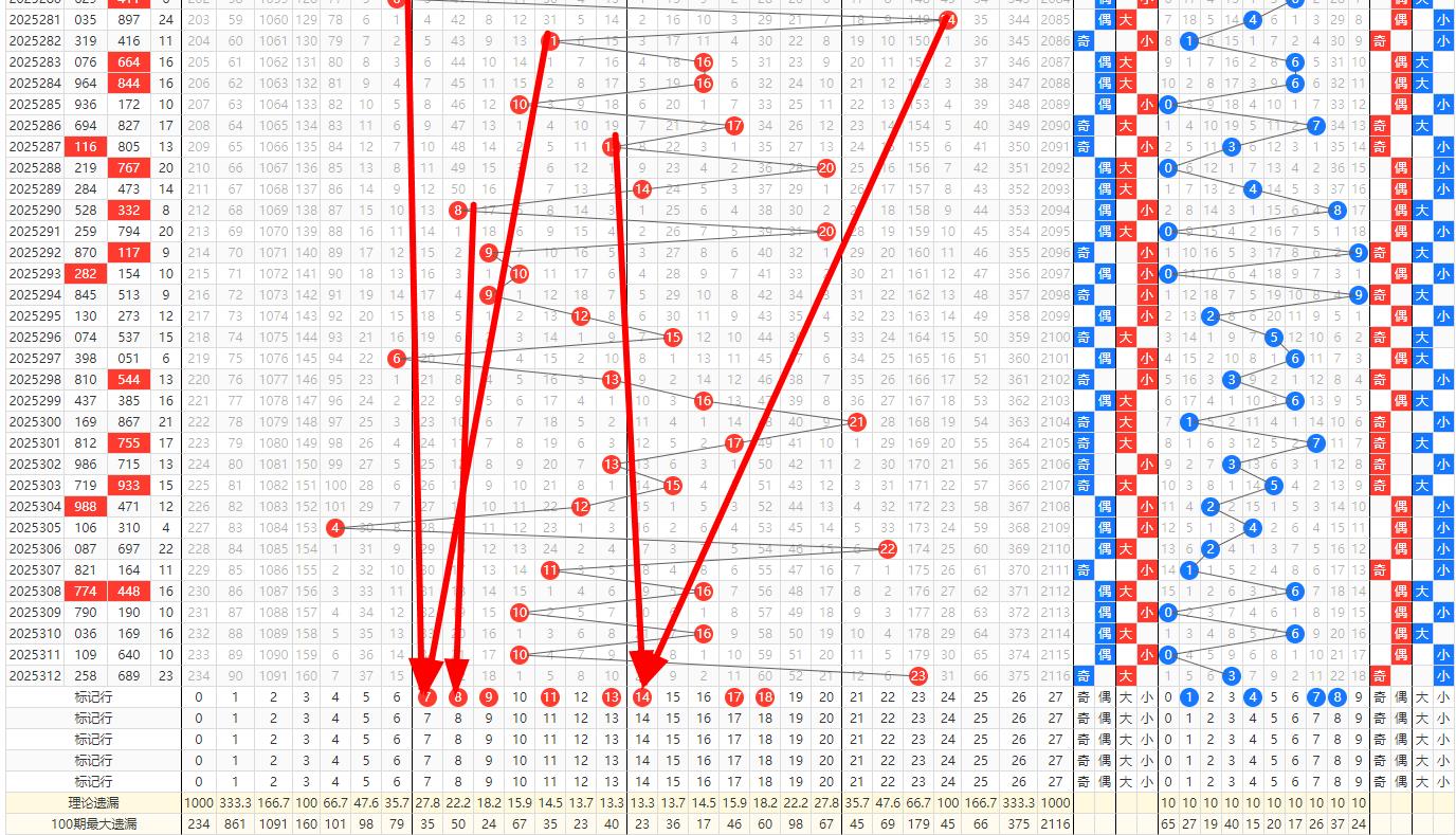 和值预判分析: 312期的开奖号码为689和值为23,这是一个相对较大的和值。在和值走势的分析中,注重和值的波动性和稳定性。考虑到近期和值的波动范围,可以预判313期的和值将走小。这样的预判不仅符合和值的波动性规律,也体现了和值的稳定性原则。和值预判为7.8.9.10.11.13.14.17.18.19.重点关注.4.5.7.9.尾.