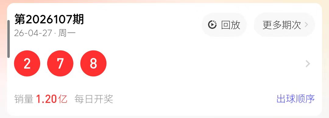 如图所示福彩3D第2026108期开奖结果为2 7 8