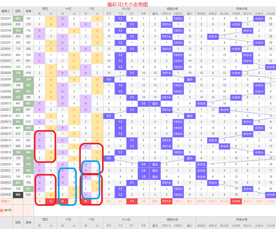 上期大小比为1:2,两小的号码组合方式,从近五期出现情况看,大号码出现10次,小号码出现5次,大号码出现较多,本期侧重两大的号码组合,本期百位侧重小号码,十位侧重大号码,个位要侧重看大,侧重小大大或者小大小的号码组合,根据大小做五码定位01234/56789/56789或01234/56789/01234