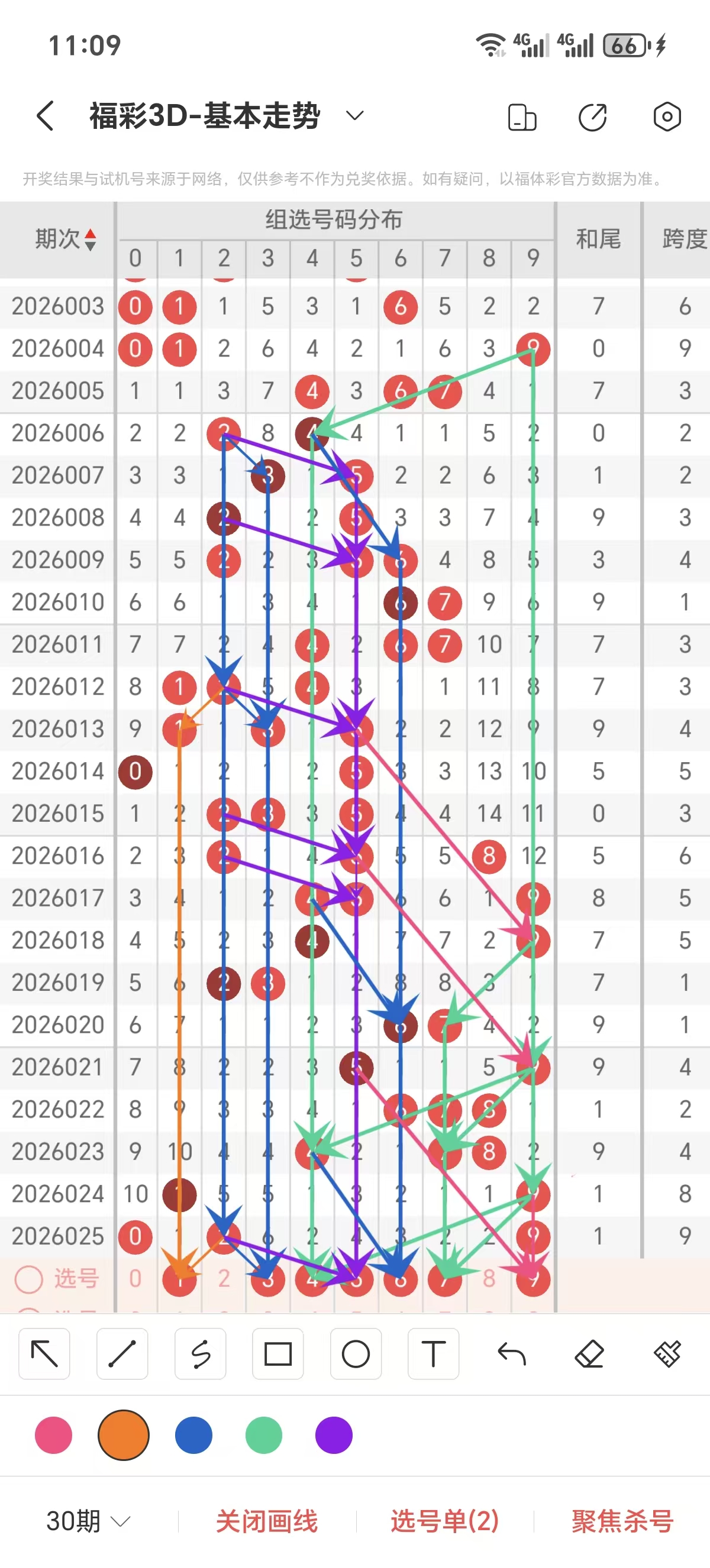 跨度通常情况下在五期之内重复一个跨度的概率很高,近五期重复了4的跨度,近五期跨度为4/2/4/8/9,近期12路的跨度较热,上期是0路的跨度,本期要侧重跨度以3/4/6跨为主的号码组合。可以从跨度方面选择相应的双胆码组合,双胆码的选取要根据近期和历史的走势进一步的分析选取。