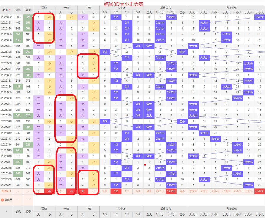 上期大小比为1:2,两小的号码组合方式,从近五期出现情况看,大号码出现7次,小号码出现8次,大小号码出现较平均,本期侧重两小的号码组合,本期百位侧重小号码,十位侧重小号码,个位要侧重看小,侧重小小大或者小大大的号码组合,根据大小做五码定位01234/01234/56789或01234/56789/56789