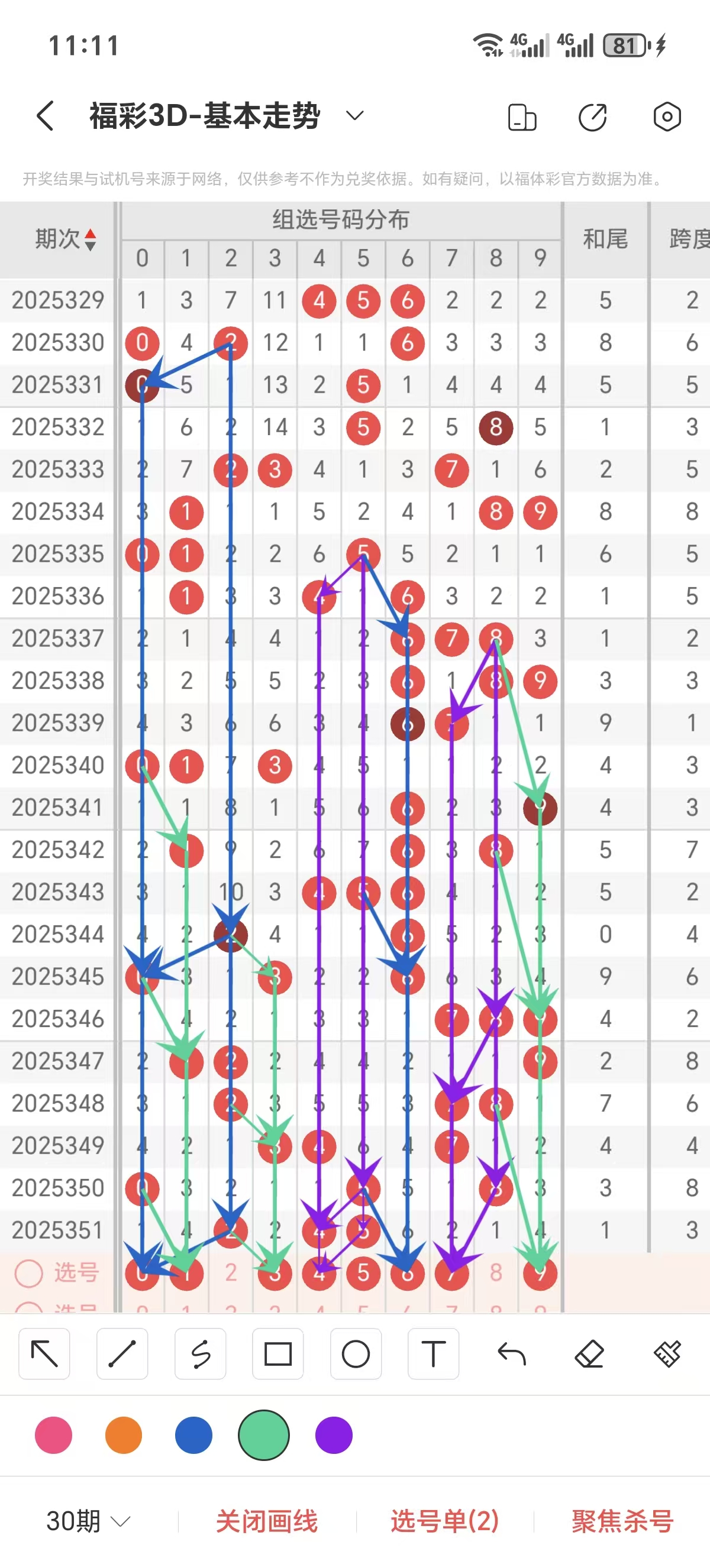 跨度通常情况下在五期之内重复一个跨度的概率很高,近五期重复了8的跨度,近五期跨度为8/6/4/8/3,近期02路的跨度较热,上期是0路的跨度,本期要侧重跨度以5/6/8跨为主的号码组合。可以从跨度方面选择相应的双胆码组合,双胆码的选取要根据近期和历史的走势进一步的分析选取。