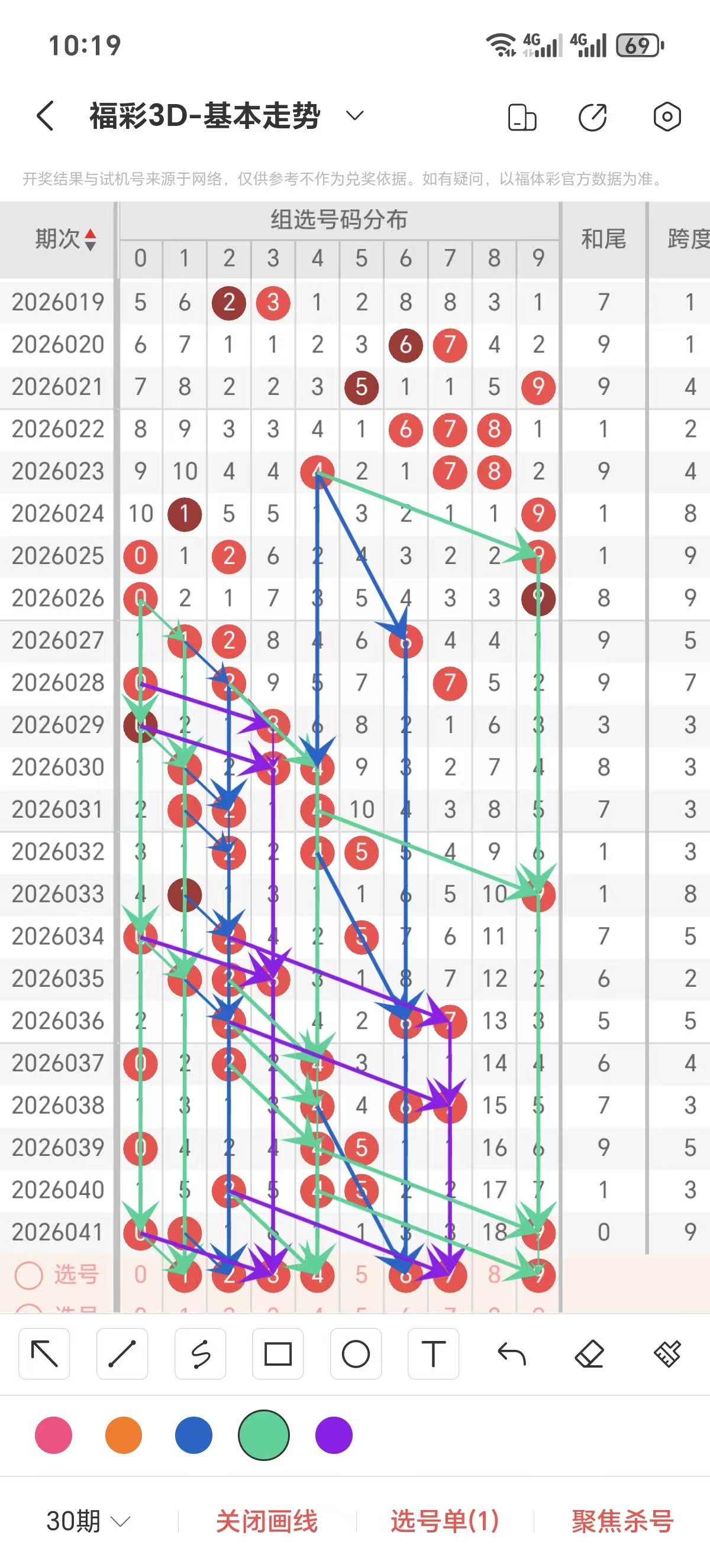 跨度通常情况下在五期之内重复一个跨度的概率很高,近五期重复了3的跨度,近五期跨度为4/3/5/3/9,近期0路的跨度较热,上期是0路的跨度,本期要侧重跨度以4/5/7跨为主的号码组合。可以从跨度方面选择相应的双胆码组合,双胆码的选取要根据近期和历史的走势进一步的分析选取。