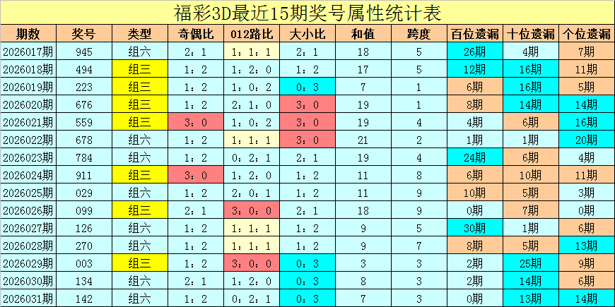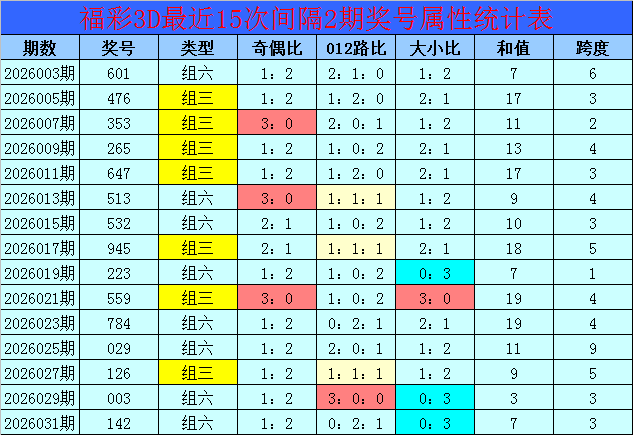 福彩3D2026031期奖号为142,奖号组选类型为:组六,012路比为021,奇偶比为12,大小比为03,和值开出7,跨度开出3