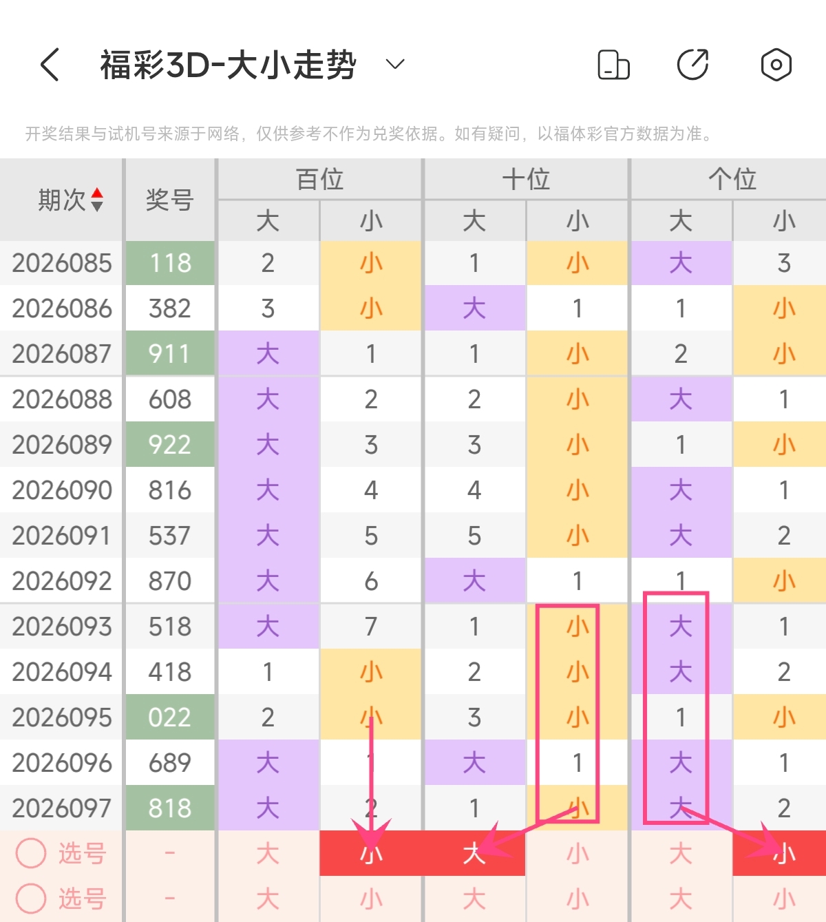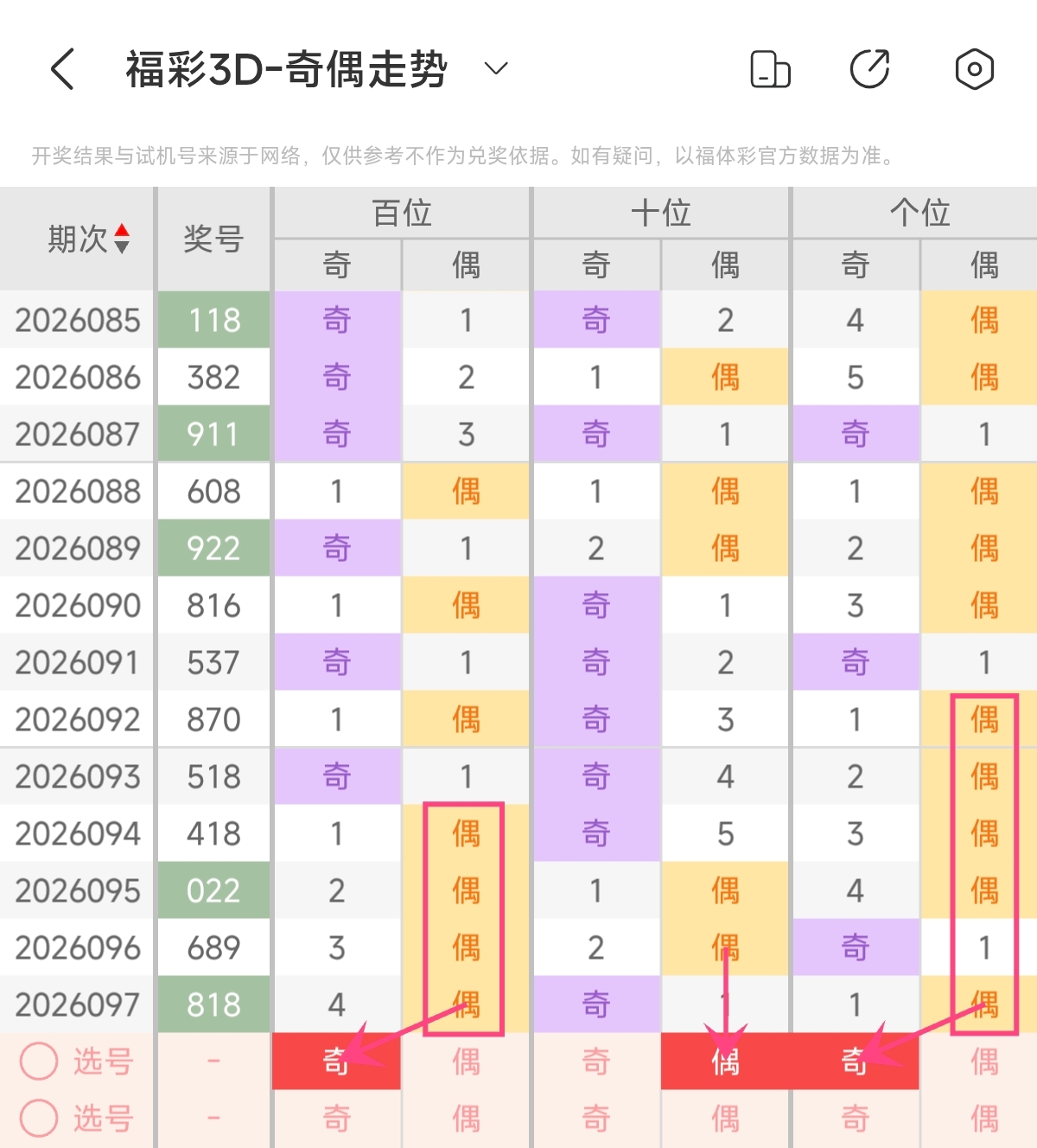 首先让我们回顾一下上期福彩3D第2026097期开奖号码为818,为组三形态,大小比为2:1,奇偶比为1:2,跨度为7,和值为17。