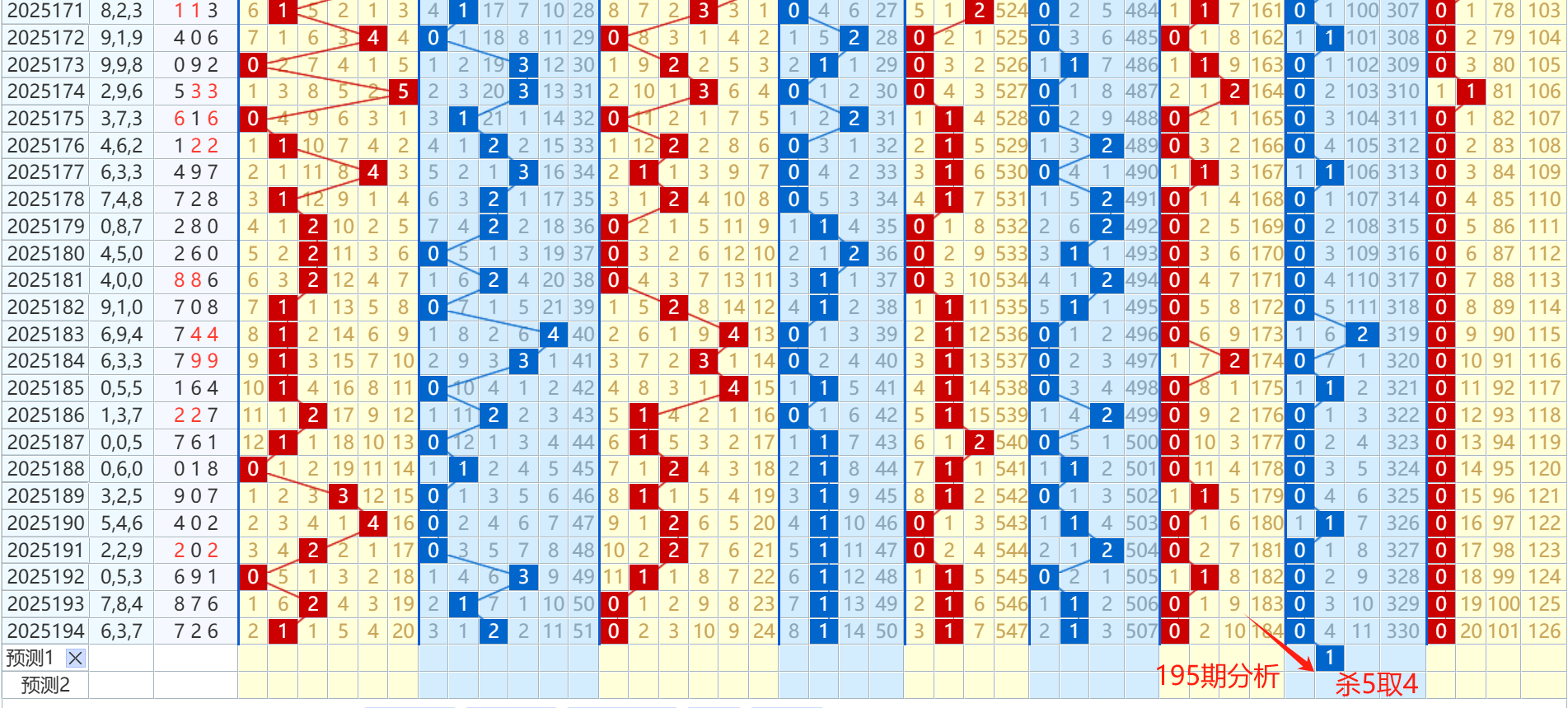 上期开出726,五行分布木木金,百十位差值5,最小值振幅4,根据近期最大值和最小值走势规律分析,最大值振幅近期最大遗漏是三期,最小值最大连出是三期,最小值振幅主要以02路交替为主,本期最小值预计要往上提升,那么意味着和值将要走大,根据近期百位十位开出双码走势可见开出组合有:49对码,77组三,金木组合,根据上期开出的形势来看,本期百位预计会围绕着小质数为主出号,主防遗漏7的2路回补;