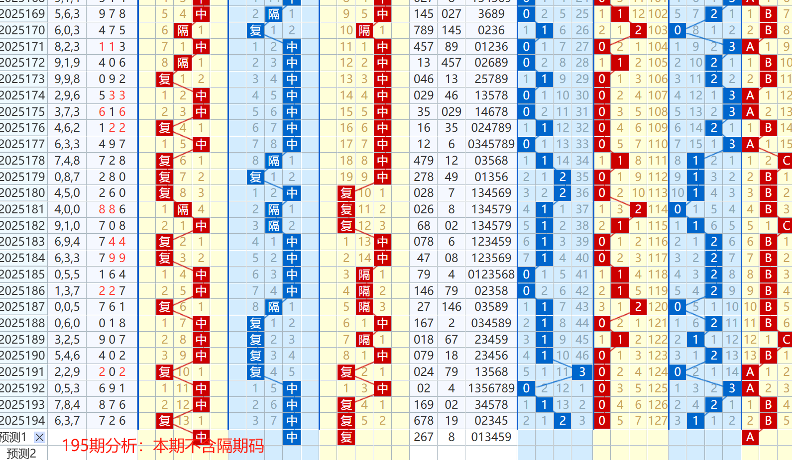上期个位开出0路大数6,属于中间值走势,上期复中隔中的复号码开出两码强力走势,考虑两码走强的组合方式,下期会保留相关一码的概率很高,故表现为有重码表现,可参考26开出个位回补;