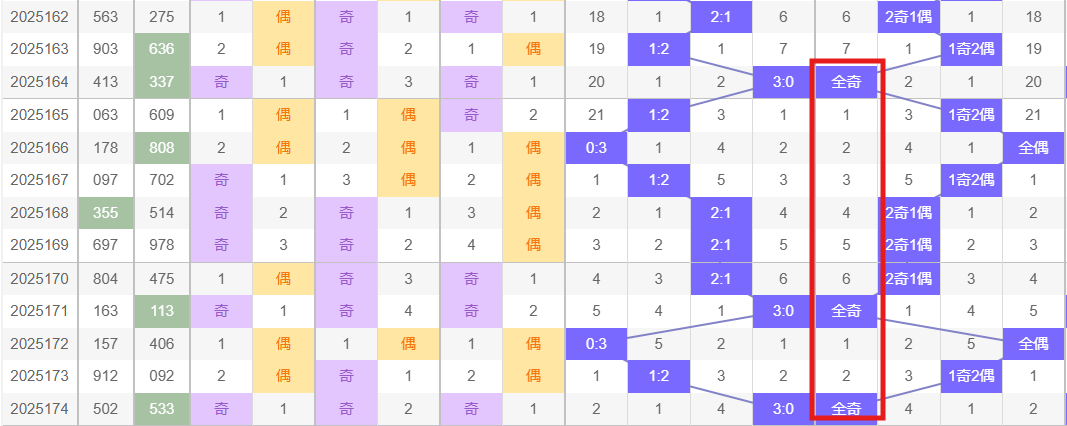 与当前高频数字兼容:百位奇数(1,3,5,7,9)占60%,十位偶数(0,2,4,6,8)占55%,个位奇数(1,3,5,7,9)近期活跃(最近10期出现5次)。