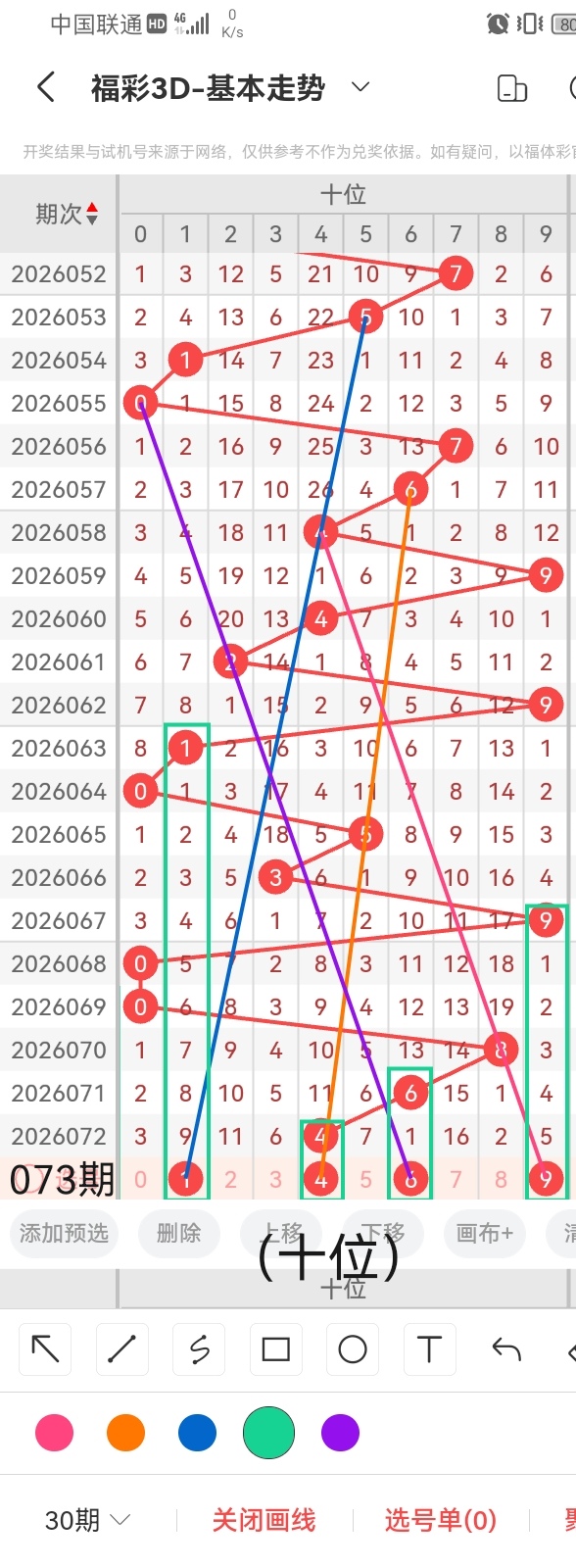 小梁结合上图中画线的思路走位分析得出,号码1与前几期开出的号码呈隔九期回补的走势且呈斜三连的走位,跨度3;号码4与前几期开出的号码呈斜三连的走位且呈直连回补的走势,跨度为0;号码6与前几期开出的号码呈斜三连的走位且呈隔期回补的走势,跨度2;号码9与前几期开出的号码呈隔五期回补的走势且呈斜三连的走位,跨度是5。综上所述,小梁推荐十位的号码是:1、4、6、9。