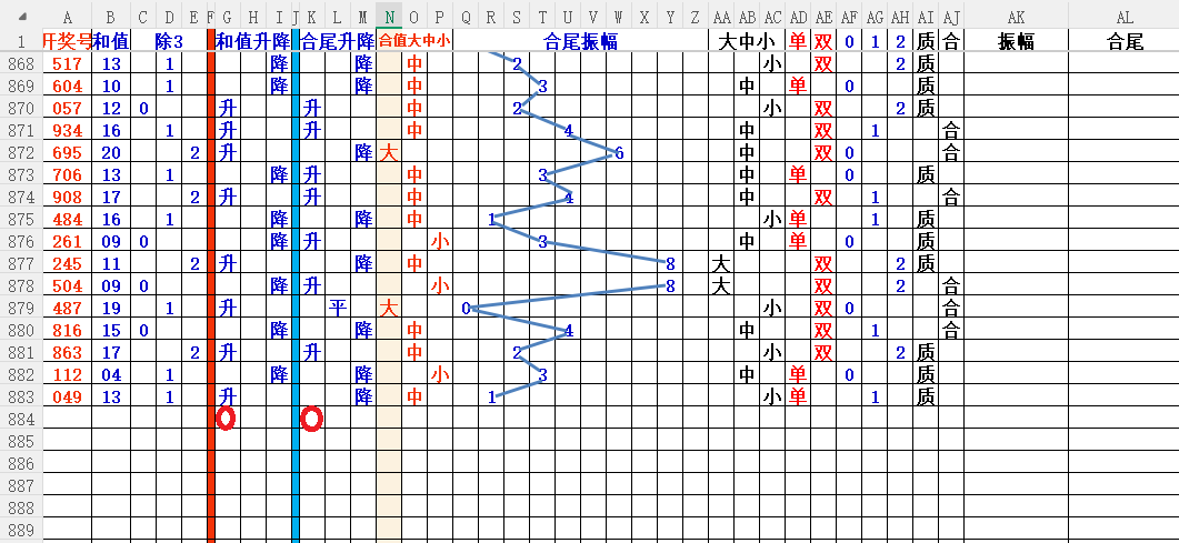 如上图3,和值升降平分析,和值升概率大,大于13和值