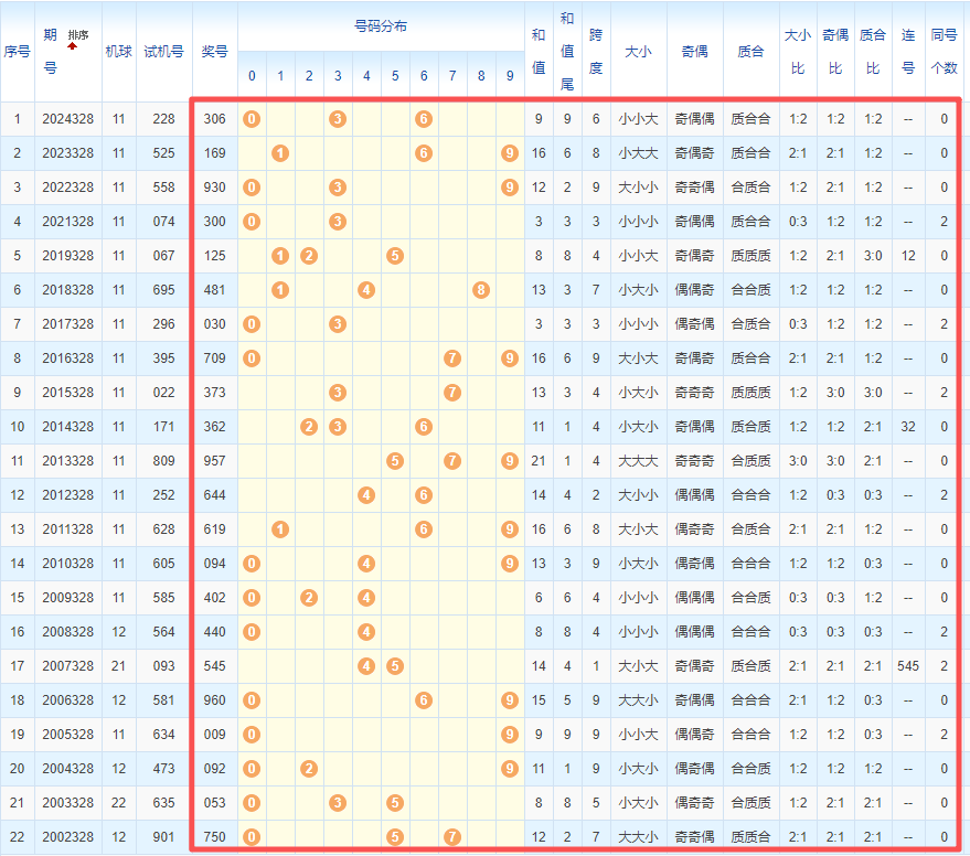 5、看连号(相连的号码)、同号个数(当期相同的号码 )