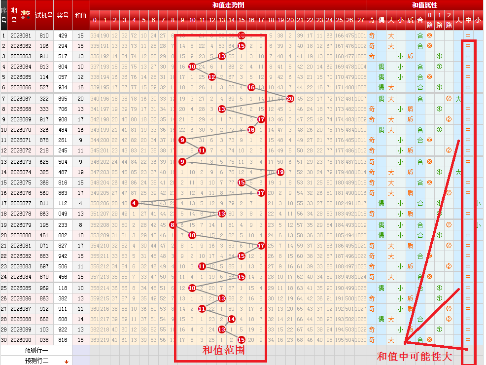 综上所述,本期和值区间9-17间,偶数和值为佳。