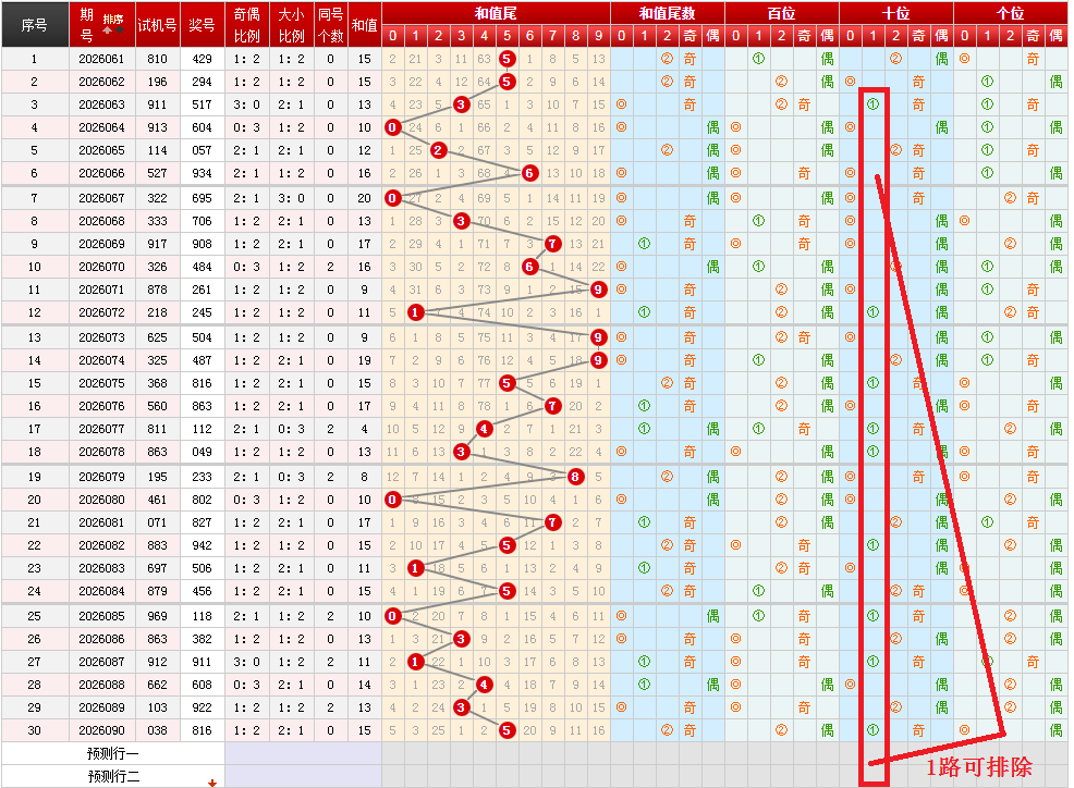 近30期和值奇共开出20期,和值偶共开出10期,和值奇强势。近五期分别开出1奇3奇0奇1奇1奇,奇数稍微弱势。观察各位置奇偶分布情况,上期开出和值奇,本期和值奇偶都有可能。