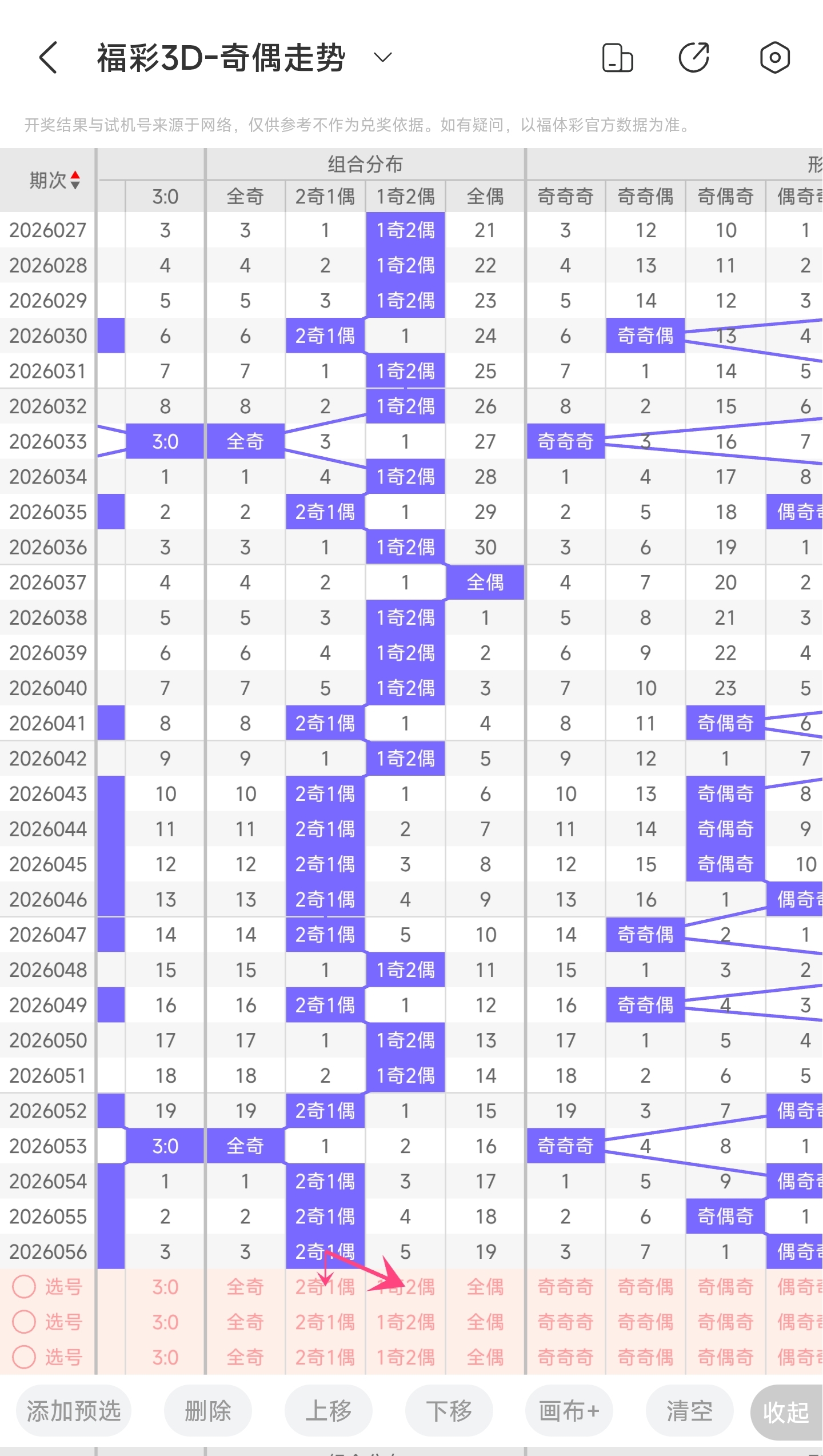 上期开了2奇1偶的情况,往前一期开出的是2奇1偶。从组合数学理论上来讲,开出2奇1偶和1奇2偶的概率都为37.5%,开出全偶和全奇的概率为12.5%。通过分析目前30期内的数据。本期的开出全偶的概率是3.33%,开出全奇的概率为6.66%,开出1奇2偶的概率为46.66%,开出2奇1偶的概率是43.33%。和前一期相比,2奇1偶概率变大,1奇2偶概率变小。通过走势图分析,上期开了2奇1偶,本期还是看好1奇2偶。所以本期推测可能开1奇2偶,其次是2奇1偶,然后是全奇或者全偶类型。
