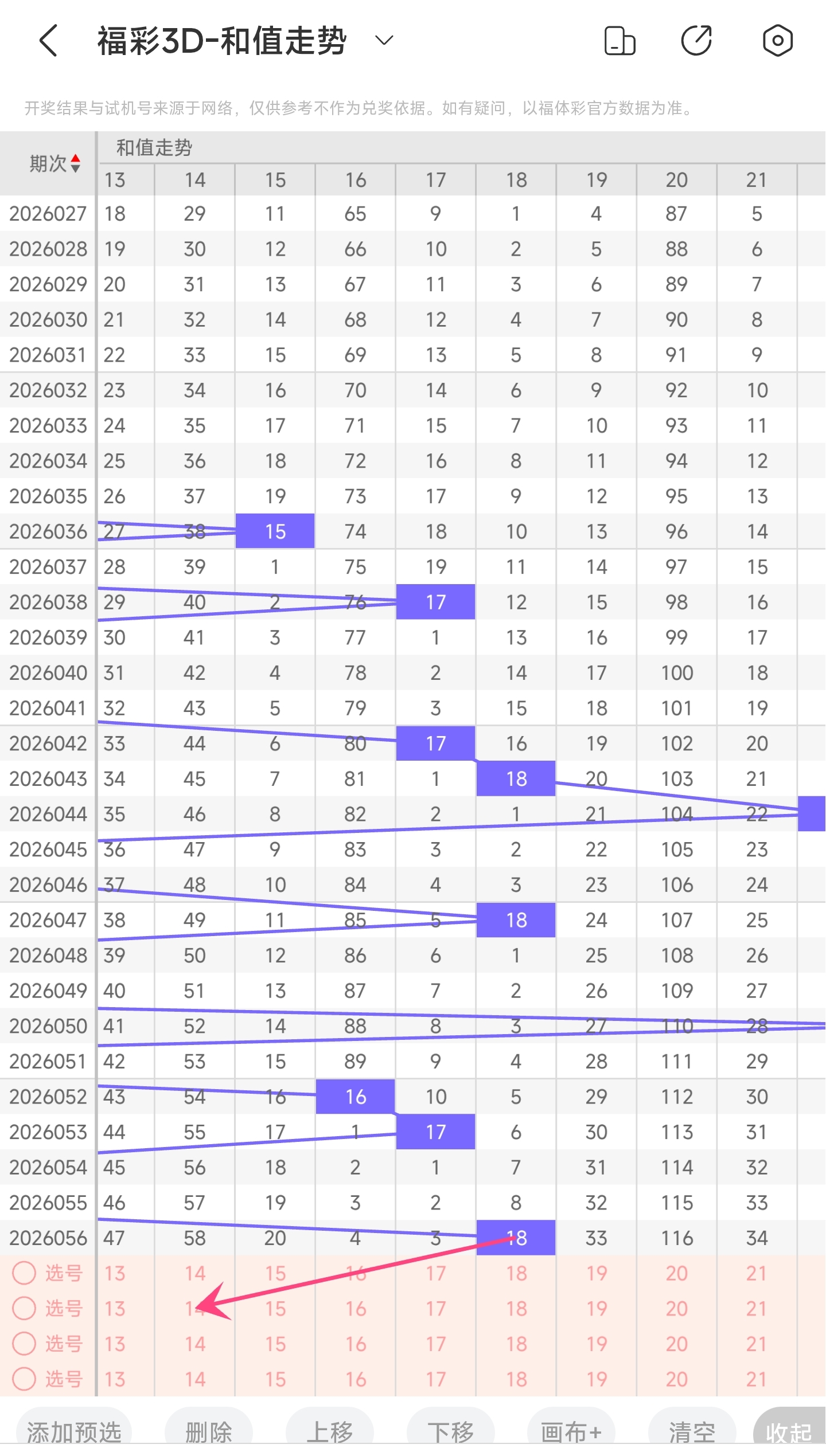 上期和值是18,往前一期和值是8。和值往右移动,偏移振幅为10。18和值是处于近30期内开出比较大的和值。下降的空间比较大,上升的空间比较小,本期比较看好和值变小,所以推测本期趋势是大概率变往左的,和值变小,小概率往右,和值变大。