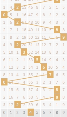 上图是福彩3D开奖号码走势分布图,我在上面走势图中标注出来的数字当成一个区域的话就是数字67890123,这个区域的数字组成的跨度二组合有68 79 80 91 02 13一共有6组,那么本期可以留意留意这些组合出现。