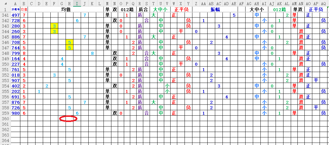 均值:就是开奖号每各数的总和除3,然后得到的余数,如果不够整除可以+1,-1,直到被整除得的数就是均值