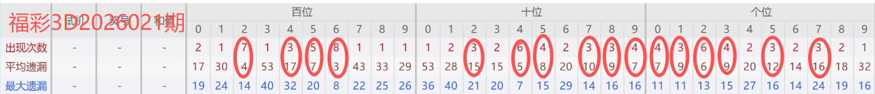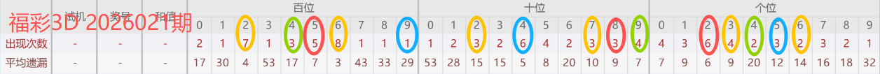 2026019期开奖号码223,我们可以看出近30期百位2出现7次,十位2出现3次,个位3出现4次。